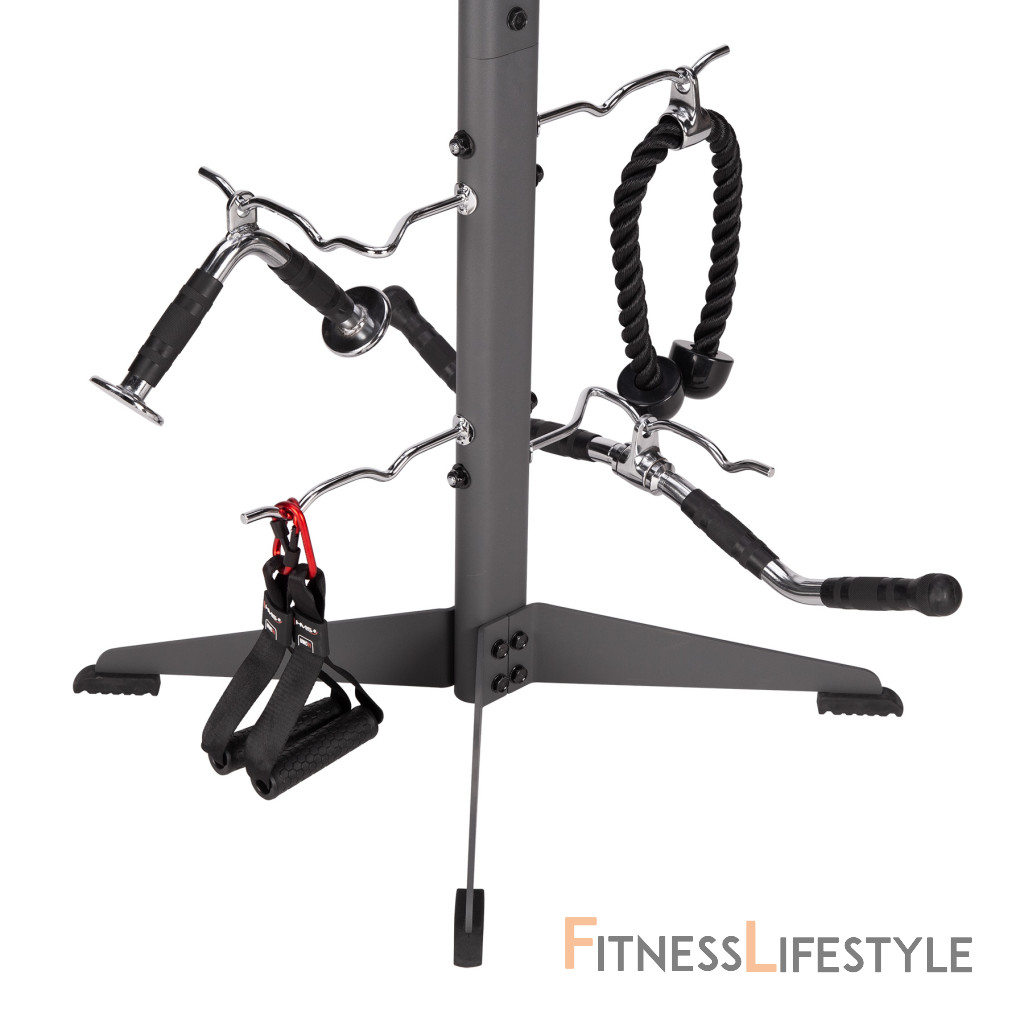 Stojan STR33 má širokú základňu s rozmermi 55 x 55 centimetrov pre skvelú stabilitu a pevnosť. Stojan je vybavený ôsmimi háčikmi, na ktoré môžete zavesiť rôzne fitness doplnky, ako sú švihadlá, adaptéry ku kladkám alebo napríklad odporové gumy. Každý háčik zvládne zaťaženie až 30 kg a vďaka jeho tvaru je možné na každý háčik zavesiť viac kusov vybavenia bez obáv o pád z háčika.