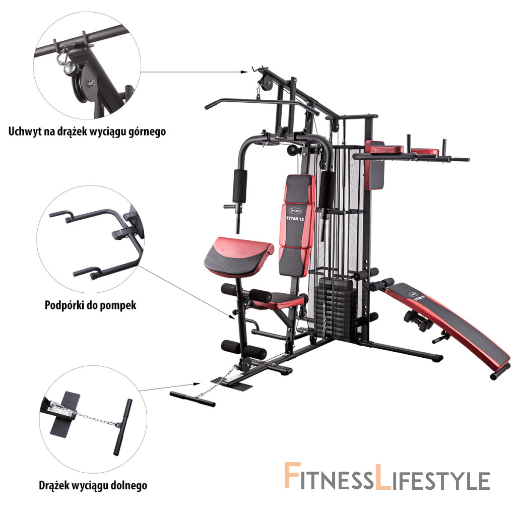 HMS Tytan 12 je moderná, posilňovacia veža pre komplexný silový tréning v domácom prostredí. Základ konštrukcie tvorí sada závaží, ktorá sa skladá z 9-tich tehál s hmotnosťou 7 kilogramov a z hornej tehly s hmotnosťou 5 kilogramov, celková hmotnosť závaží teda je 68 kilogramov. Súprava závaží je pre maximálnu bezpečnosť krytá drôtenou klietkou. Záťaž je pomocou sady kladiek s ložiskami a oceľových lán rozvádzaná k jednotlivým aktívnym prvkom: