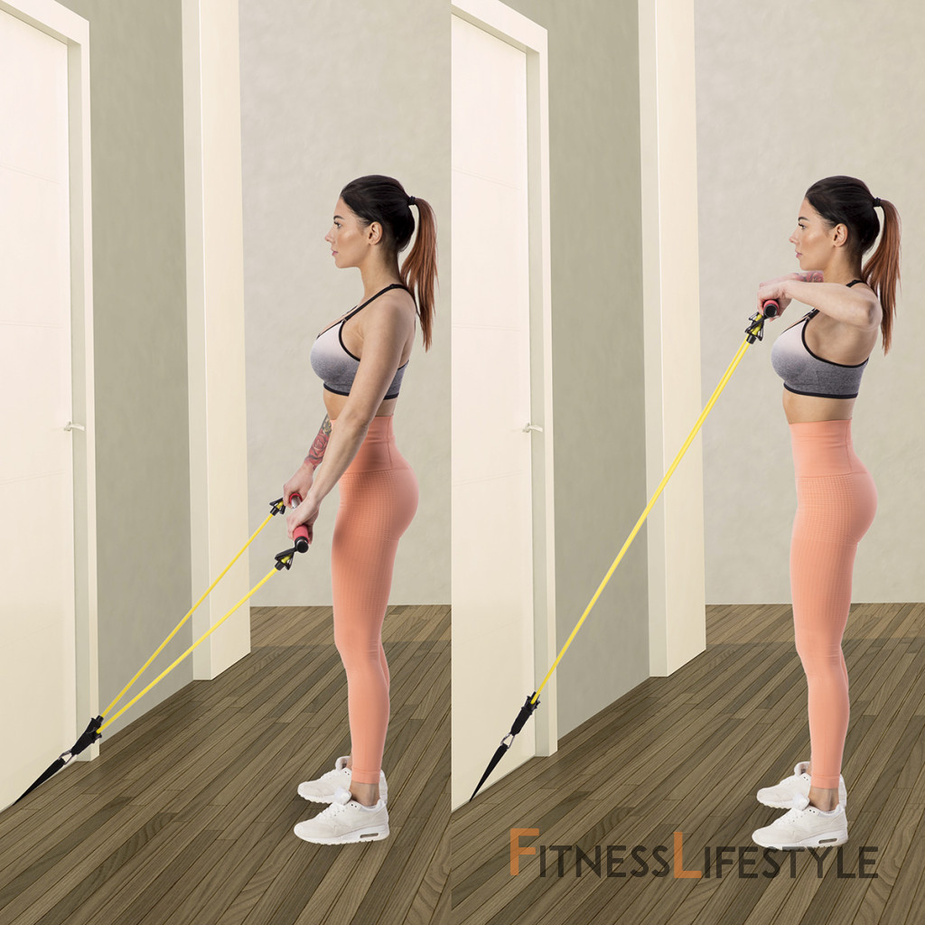 Ako príklad uvádzame cvik, kedy sa na tyč postavíte a expadnéry priťahujete smerom k telu. Prípadne si rukoväte expanderov nasadíme na chodidal a priťahujeme tyč.