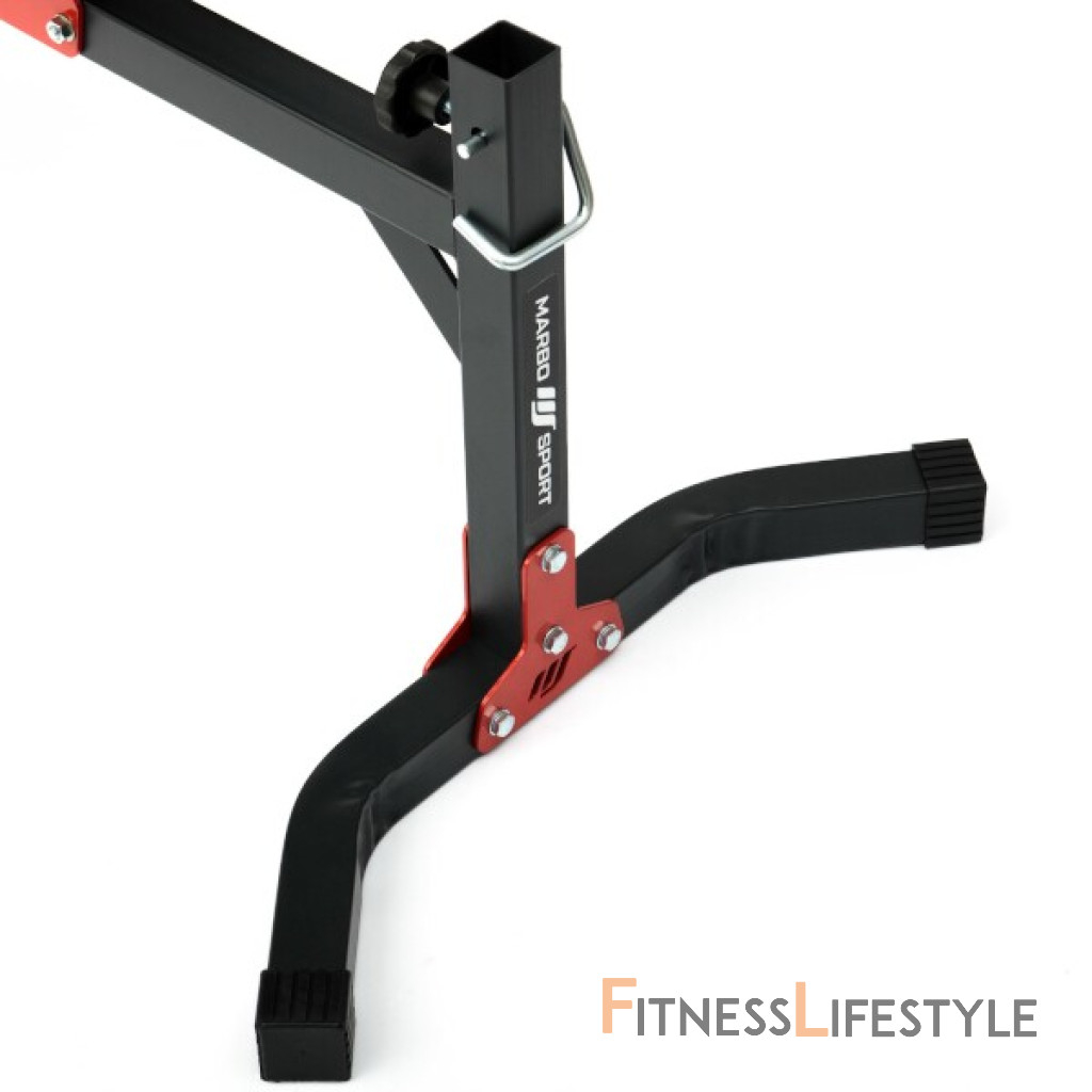 Praktickou stránkou lavice MARBO MH-L115 2.0 je regulácia chrbtovej opierky, ktorá sa vykonáva pomocou skrutiek s plastovým, ergonomickým úchytom. Polstrovanie sme obstarali dvojitými švami pre maximálnu pevnosť. V najnamáhanejším mieste sme opierku presunuli druhou vrstvou kože s logom MARBO Sport. Lavica MH-L115 2.0 má prípravu pre montáž voliteľného príslušenstva, ako je kladka, bicepsová opora, alebo predkopávanie.