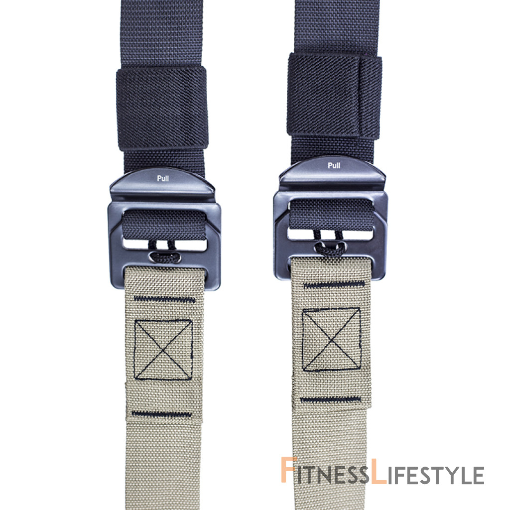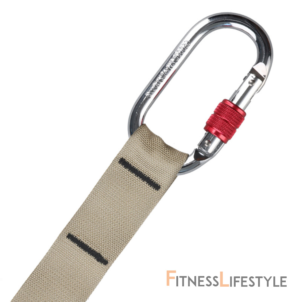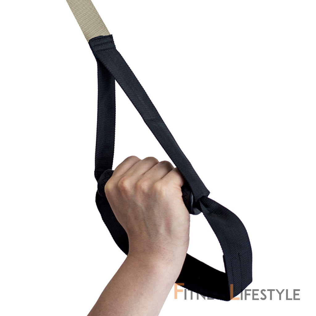 Súprava obsahuje popruhy s úchytmi a kovovou karabínou, predlžovací popruh, zarážku za dvere a vrecko na uskladnenie. Rukoväte sú pogumované, aby vám pri cvičení nešmýkali ruky.
