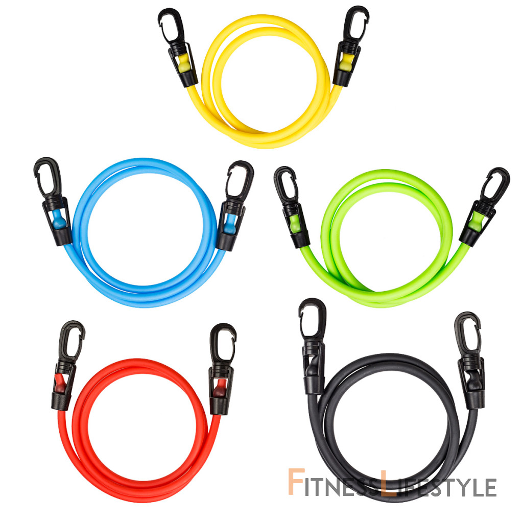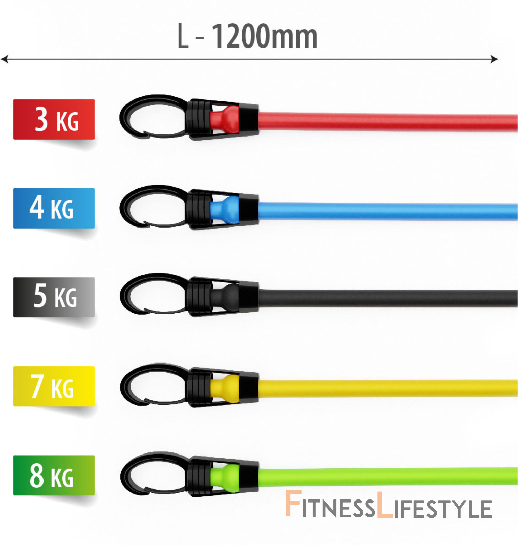 Každá dvojica gum má inú tuhosť, ktorá vám umožní vybrať rôzne úrovne intenzity cvičenia. Na každej z gúm môže byť rukovät, čo umožňuje realizáciu komplexného tréningu všetkých svalových skupín.