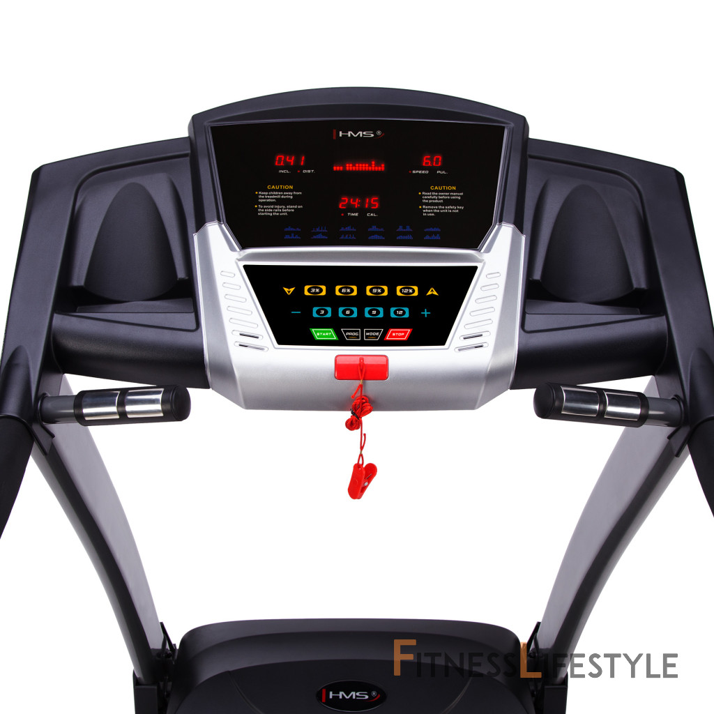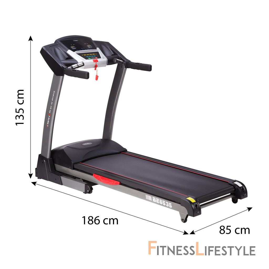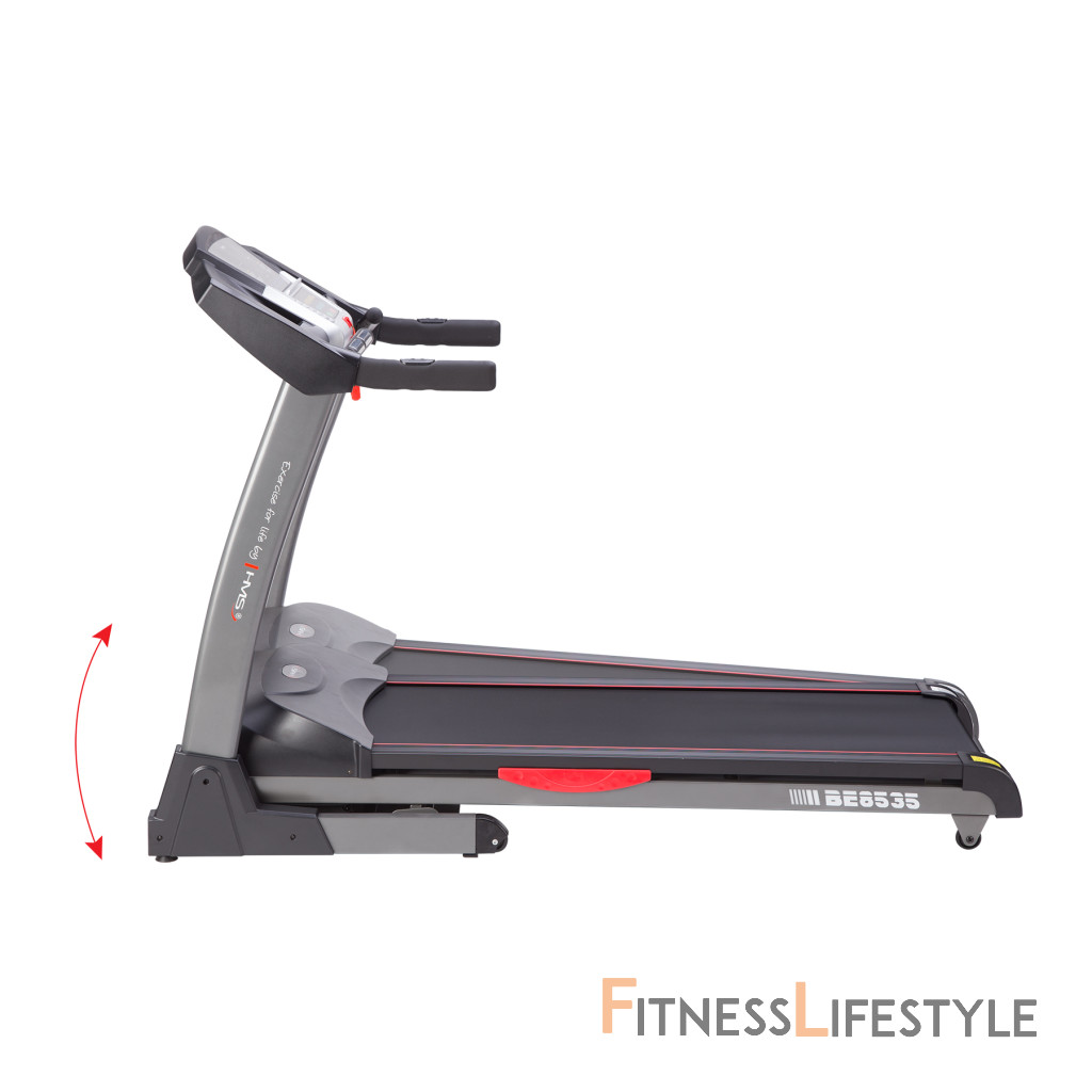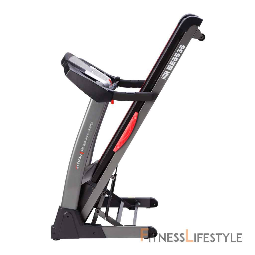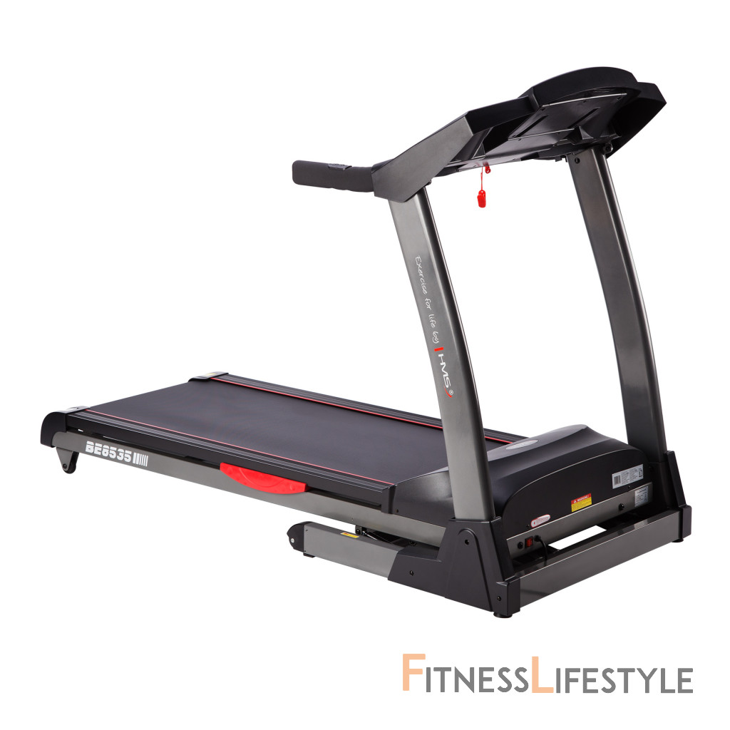 Bežecký pás BE8535 HMS je moderný, robustný bežecký trenažér s možnosťou ľahkého zloženia a snímačmi tepovej frekvencie v rukovätiach. Tichý motor s výkonom 3,5 HP zaručí maximálnu rýchlosť 22 km/h. Odpružená bežecká plocha s možnosťou elektronického zdvihu pásu, ponúka dostatok komfortu pre každodenný tréning. Všetky potrebné informácie vám prehľadne zobrazí podsvietený LED displej, pod ktorý si vďaka praktickej opierke môžete umiestniť napríklad tablet. Výhodou sú zabudované kolieska pre ľahký presun pásu na požadované miesto. Vďaka týmto vlastnostiam je bežecký pás BE8535 HMS vhodným doplnením každej domácej posilňovne.