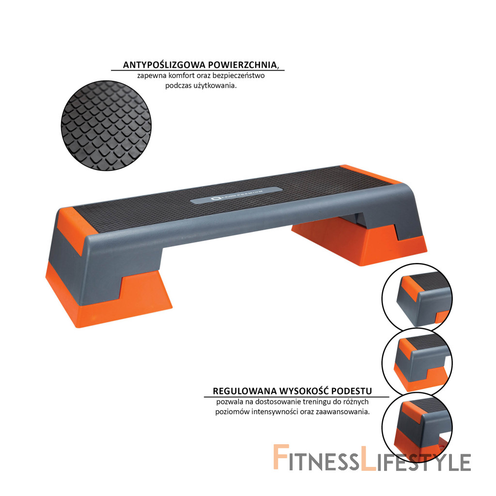 Krok je vybavený povrchom proti sklzu, ktorý zaisťuje určitý pohyb aj počas dynamického cvičenia. Gumové nohy bránia posunutiu stepovej a záruky stability a bezpečnosti.