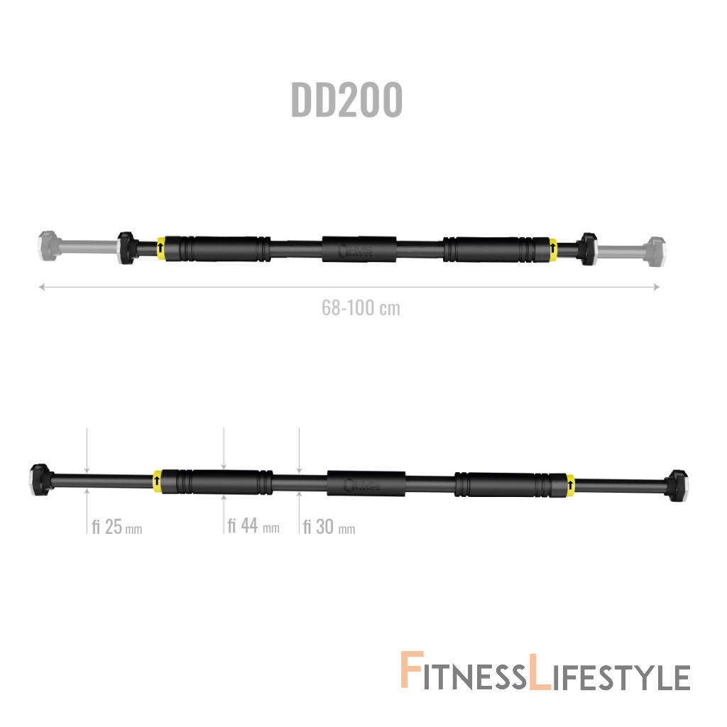 Hrazda do dverí HMS Premium DD200 je ideálnym riešením, ak nemáte dostatok priestoru pre obstaranie stacionárne hrazdy. Model DD200 disponuje nastaviteľnou dĺžkou v rozsahu od 66,5 do 100 cm a nosnosťou 250 kilogramov.