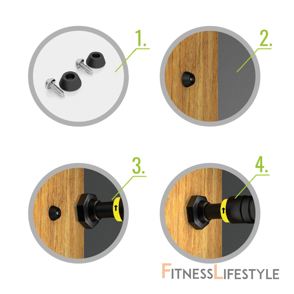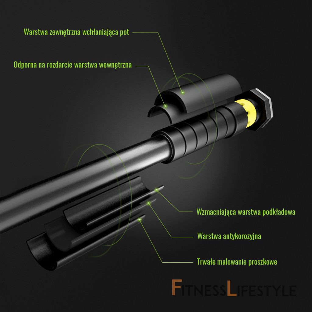 Koncovky hrazdy sú opatrené vrstvou silikónu, ktorý zamedzuje zosunutiu hrazdy zo svojho miesta, pre ešte pevnejšie inštaláciu sú súčasťou balenia 2 gumové zarážky, ktoré sa naskrutkujú do zárubní a hrazda sa nasadí na ne. Špeciálne, žltá objímka je posuvná a zamedzuje povolenie dotiahnuté hrazdy. Penové návleky sú opatrené vrstvou, ktorá odvádza pot a tým zamedzuje skĺznutiu dlane. Oceľová konštrukcia je ošetrená základovou farbou, antikoróznou vrstvou a práškovým lakom.