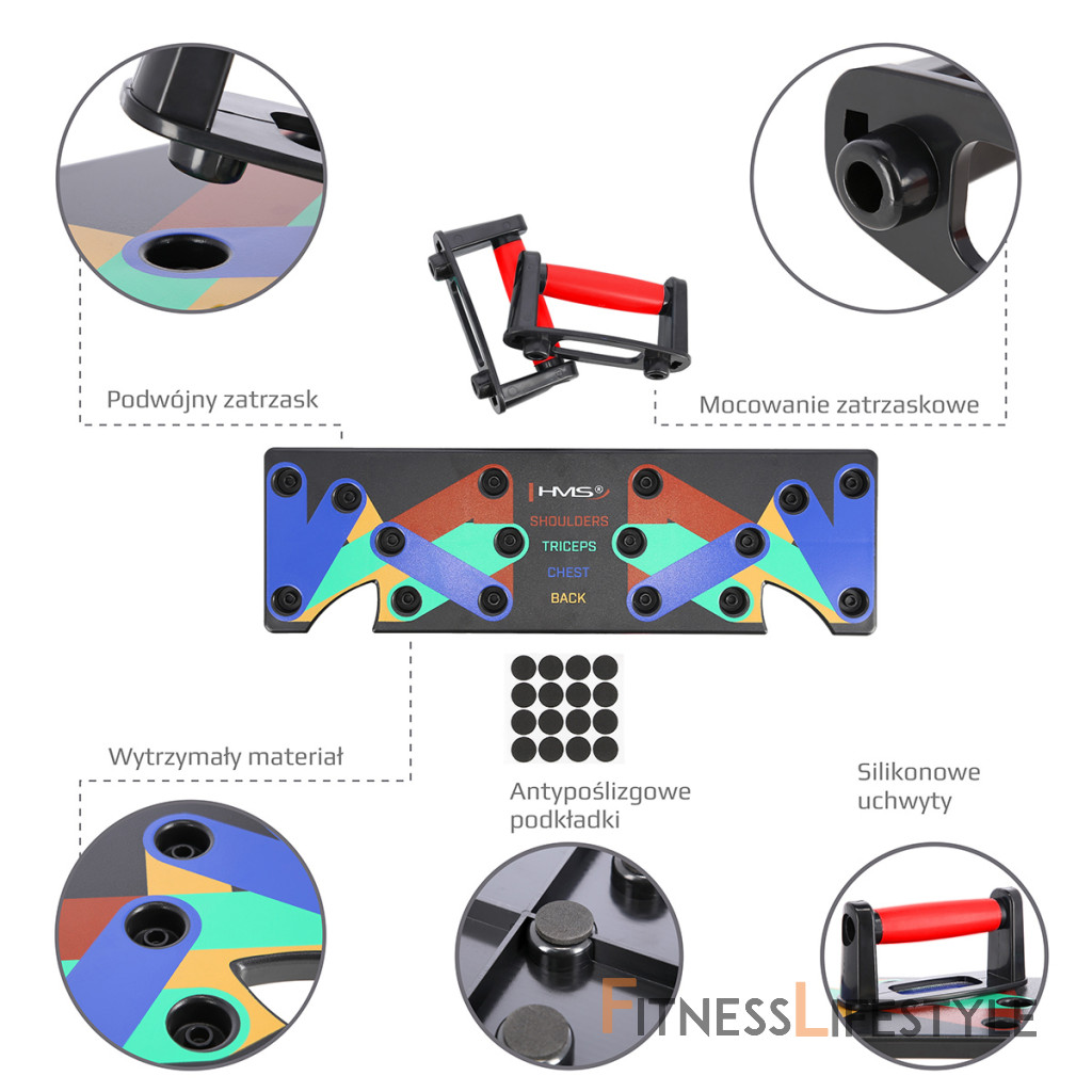 PU10 HMS je multifunkčný, skladacia doska, ktorá umožňuje variabilné tréning klikov. Doska je symetricky rozdelená na 2 polovice. PU10 obsahuje 5 párov otvorov pre umiestnenie dodávaných podpier. Každý pár otvorov umožňuje tréning pod iným uhlom, kedy sa precvičuje iná svalová skupina a to: