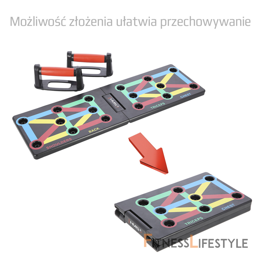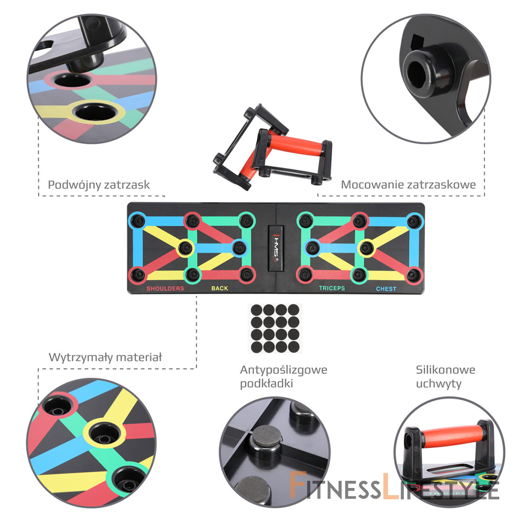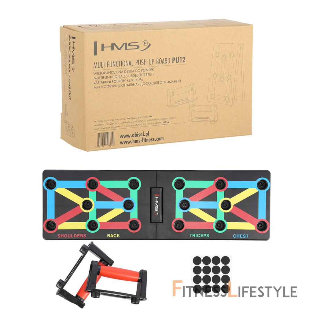 PU12 HMS je multifunkčný, skladacia doska, ktorá umožňuje variabilné tréning klikov. Doska je symetricky rozdelená na 2 polovice. PU12 obsahuje 8 párov otvorov pre umiestnenie dodávaných podpier. Každý pár otvorov umožňuje tréning pod iným uhlom, kedy sa precvičuje iná svalová skupina a to: