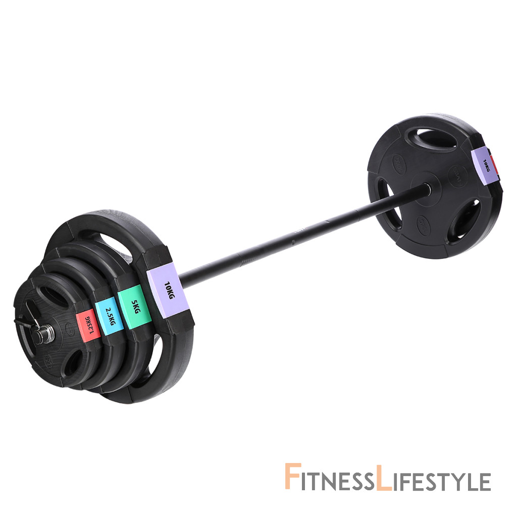 Kotúče sú vyrobené z trvdého plastu, ktorý je vyplnený cementom. Obojručné os je tvorená z troch častí, ktoré sa do seba skladajú pomocou skrutkovania. Nakladacie tŕne sú hladké a závažia sa zabezpečuje pružinovými svorkami. Tŕne jednoručných činiek sú opatrené závitom a závažia je istené hviezdicovými maticami.