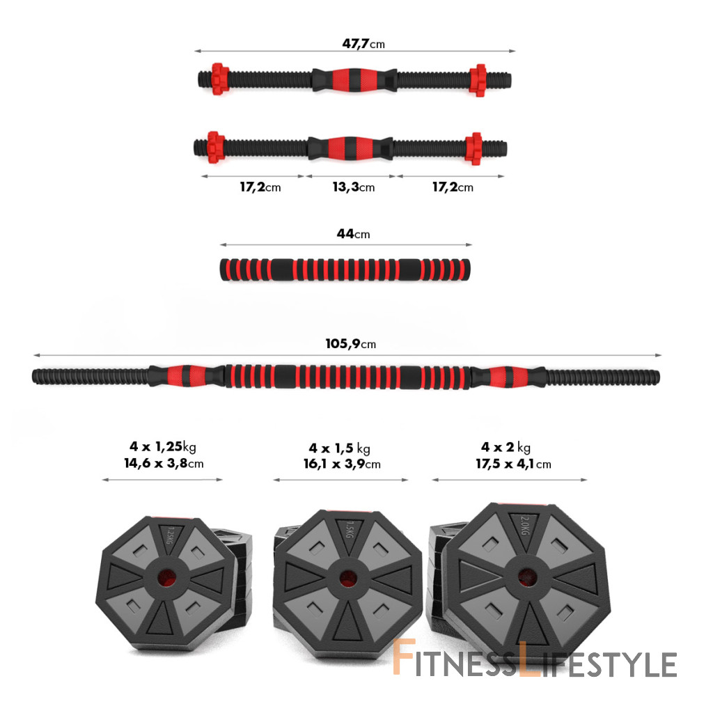 Kotúče sú vyrobené z trvdého plastu, ktorý je vyplnený cementom. Obojručné os je spojovacím dielom, do ktorého sa všroubují hriadeľa jednoručných činiek. Nakladacie tŕne sú opatrené závitom a závažia sa zabezpečuje pomocou hviezdicových matíc. Šesťhranný tvar kotúčov navyše zamedzuje ich odvaľovania. Činky sa Vám tak nikam neodkutálí a budete ich mať vždy tam, kde ste ich odložili.