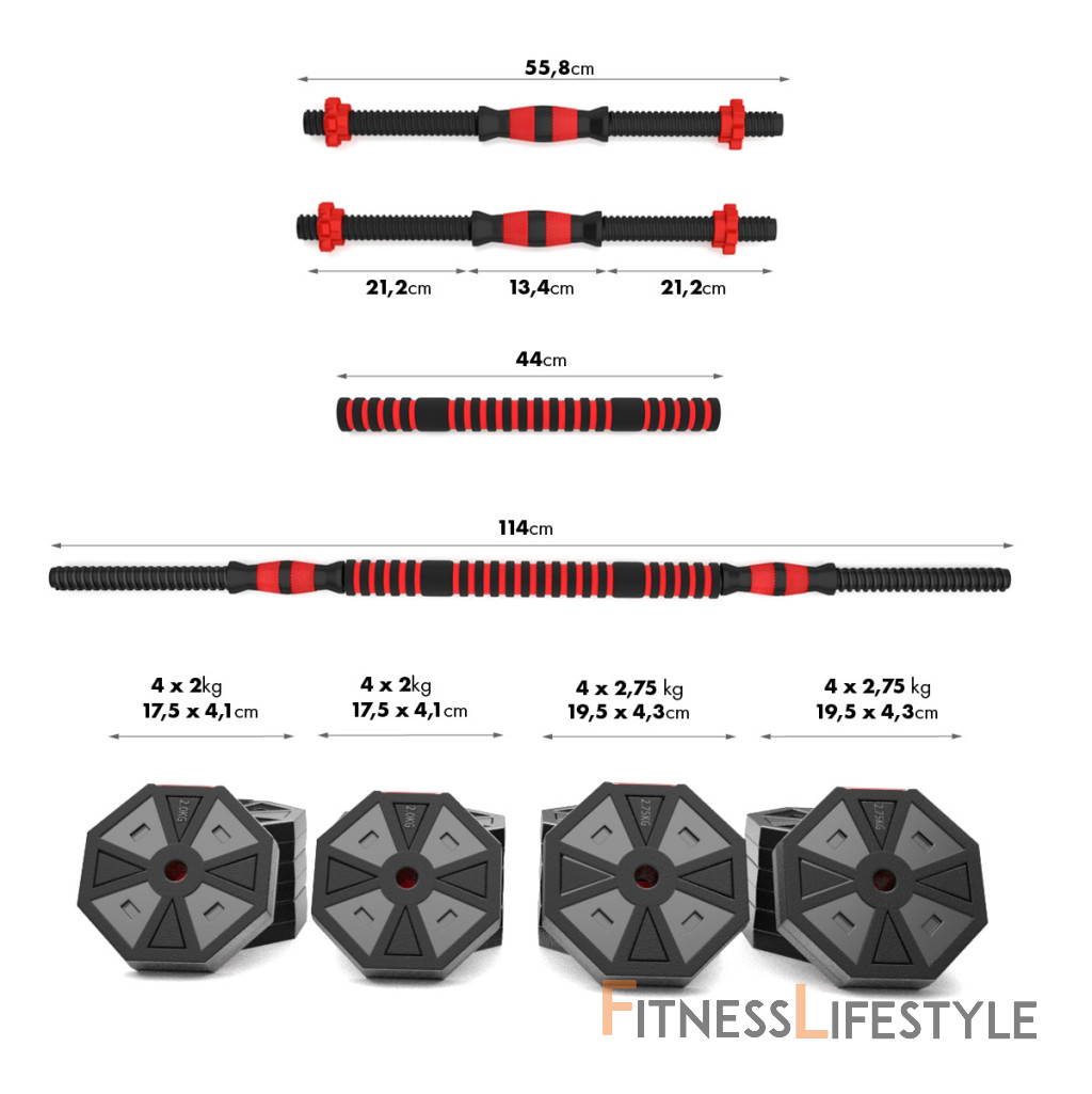 Kotúče sú vyrobené z trvdého plastu, ktorý je vyplnený cementom. Obojručné os je spojovacím dielom, do ktorého sa všroubují hriadeľa jednoručných činiek. Nakladacie tŕne sú opatrené závitom a závažia sa zabezpečuje pomocou hviezdicových matíc. Šesťhranný tvar kotúčov navyše zamedzuje ich odvaľovania. Činky sa Vám tak nikam neodkutálí a budete ich mať vždy tam, kde ste ich odložili.