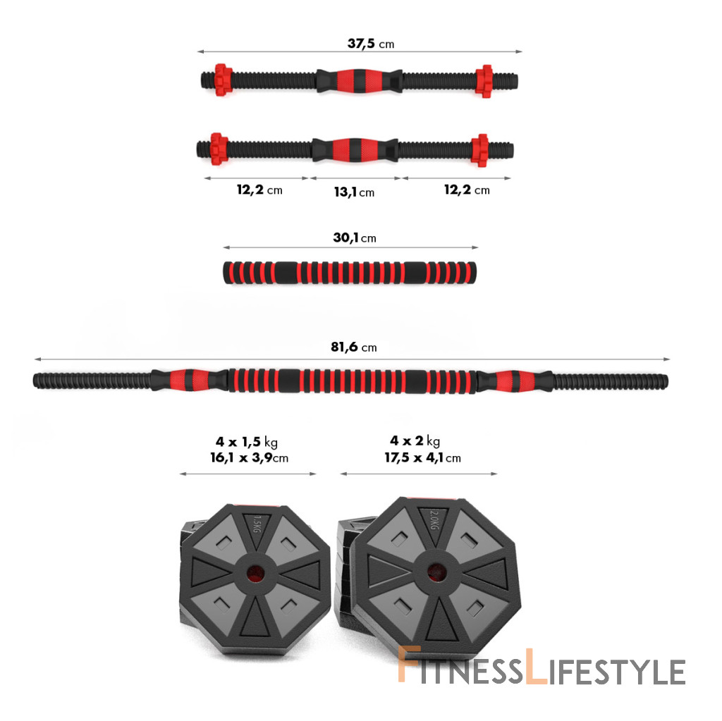 Kotúče sú vyrobené z trvdého plastu, ktorý je vyplnený cementom. Obojručné os je spojovacím dielom, do ktorého sa všroubují hriadeľa jednoručných činiek. Nakladacie tŕne sú opatrené závitom a závažia sa zabezpečuje pomocou hviezdicových matíc. Šesťhranný tvar kotúčov navyše zamedzuje ich odvaľovania. Činky sa Vám tak nikam neodkutálí a budete ich mať vždy tam, kde ste ich odložili.