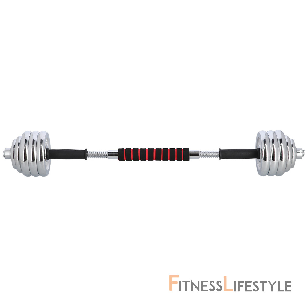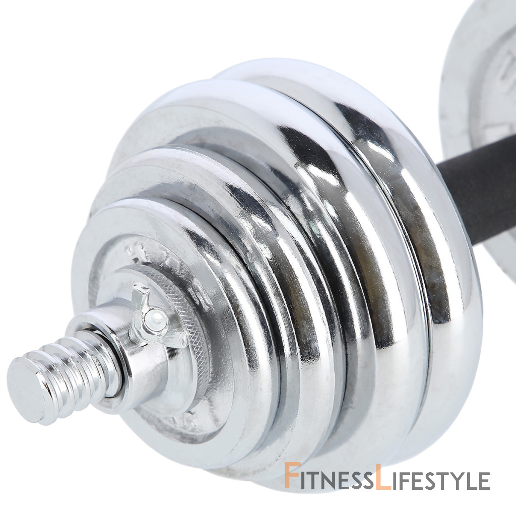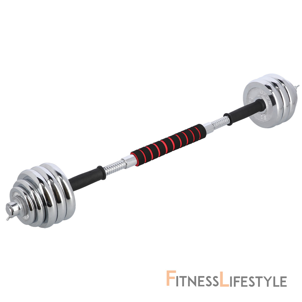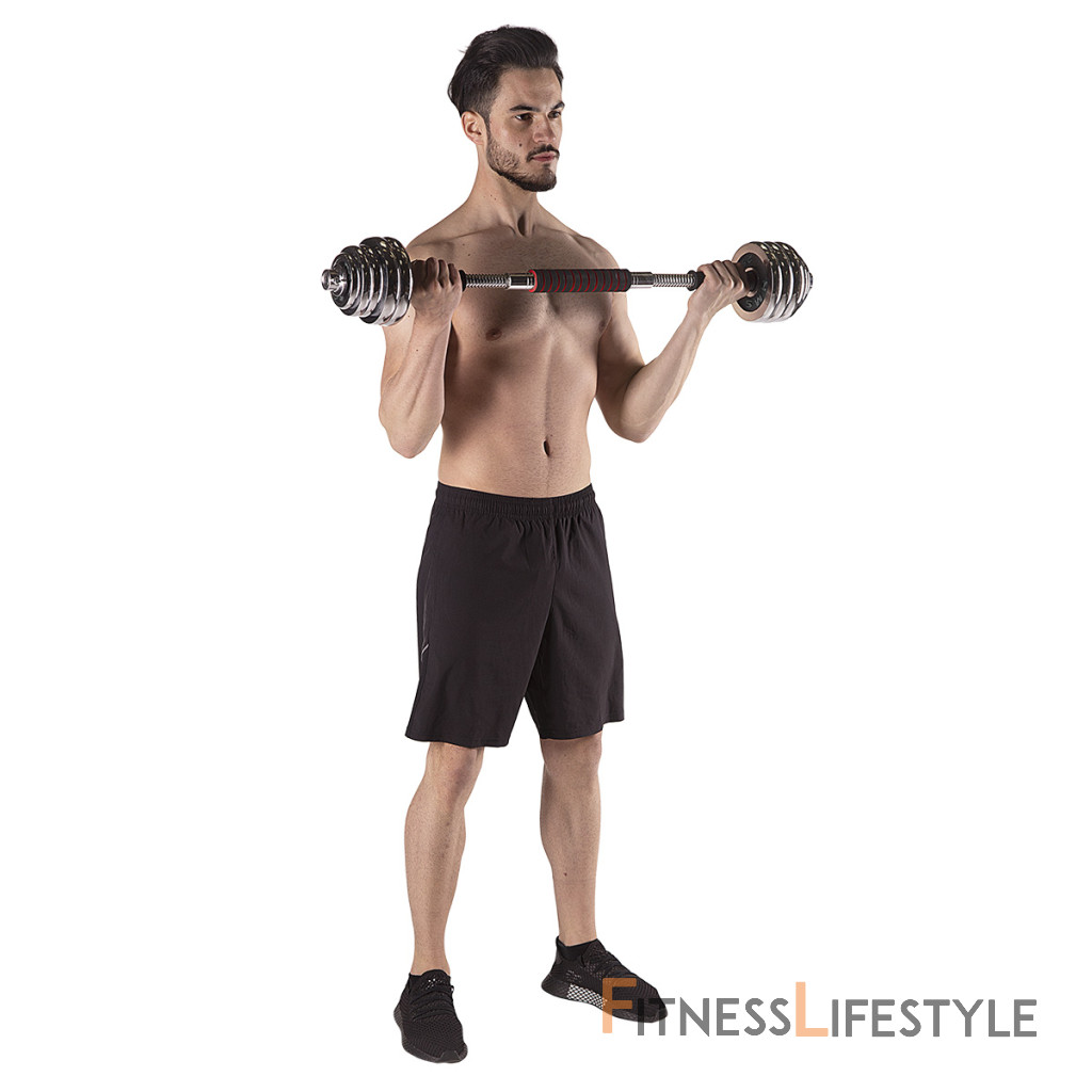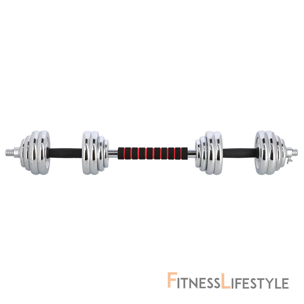 Činky sú vyrobené z vysoko kvalitnej, chrómovanej ocele, ktorá je zárukou dlhej životnosti. Kotúče sa proti posunutiu zaisťujú skrutkovacími zámkami, ktoré sú dodatočne istené skrutkou s krídlovou matkou.