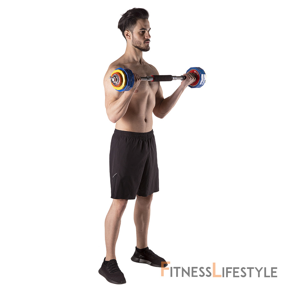 Činky sú vyrobené z vysoko kvalitnej, chrómované ocele, ktorá je zárukou dlhej životnosti. Kotúče sú pokryté vrstvou PVC, ktoré chránia ako podlahu, ako aj samotné kotúče pred poškodením v prípade nechceného upustenia činky. Kotúče sa proti posunutiu zaisťujú skrutkovacími zámky, ktoré sú dodatočne istené skrutkou s krídlovou matkou.