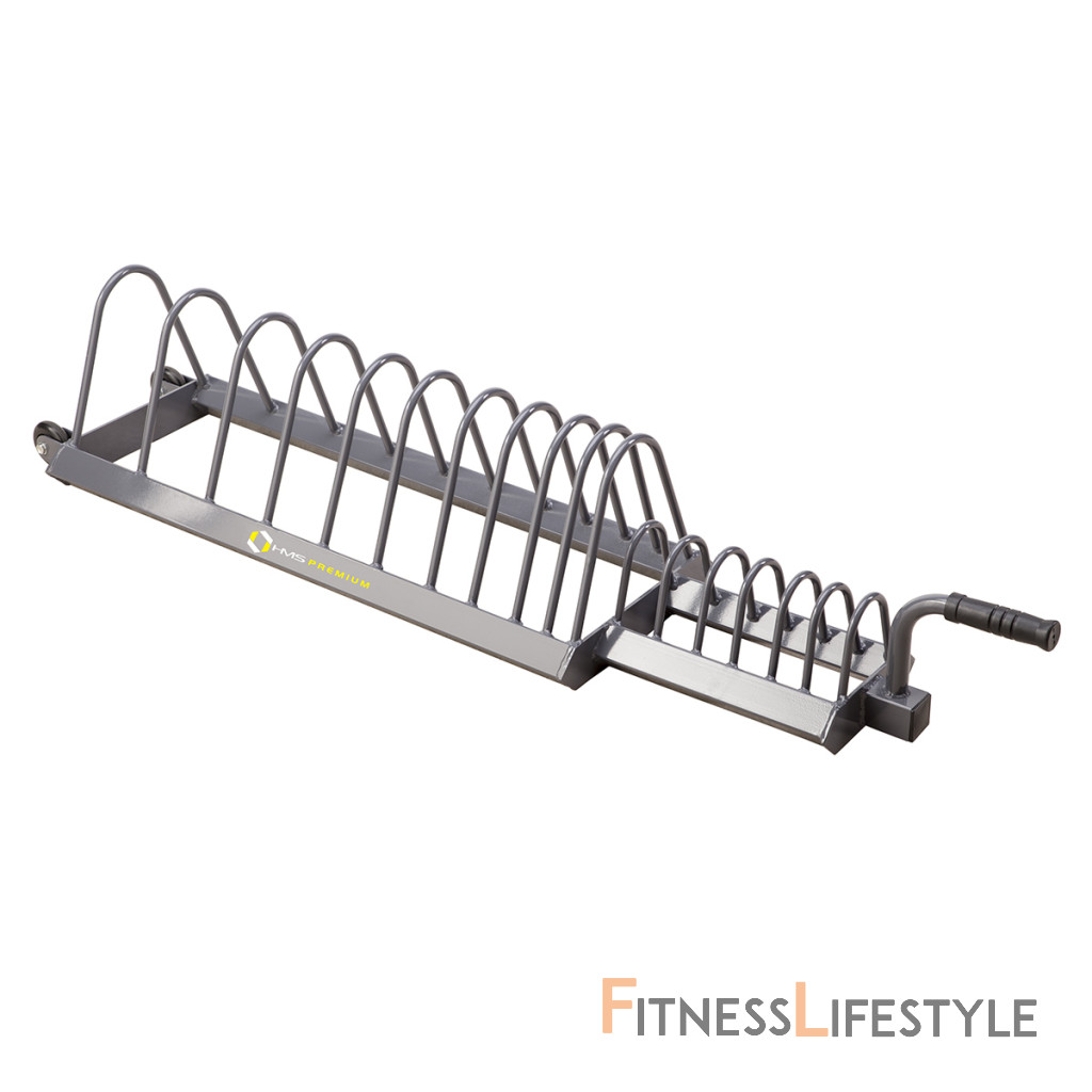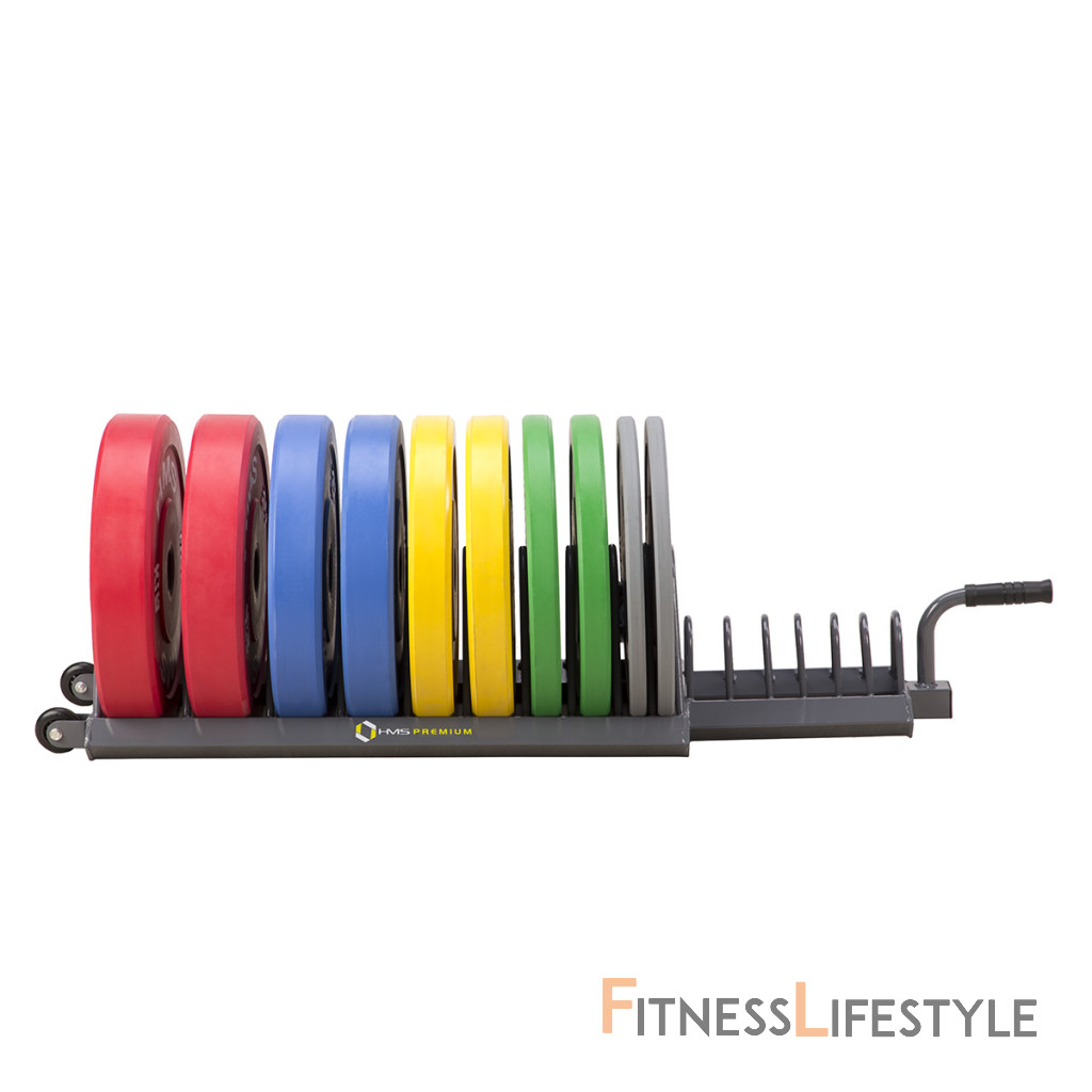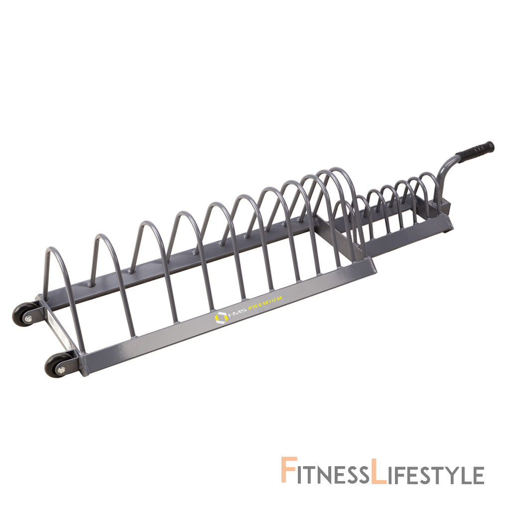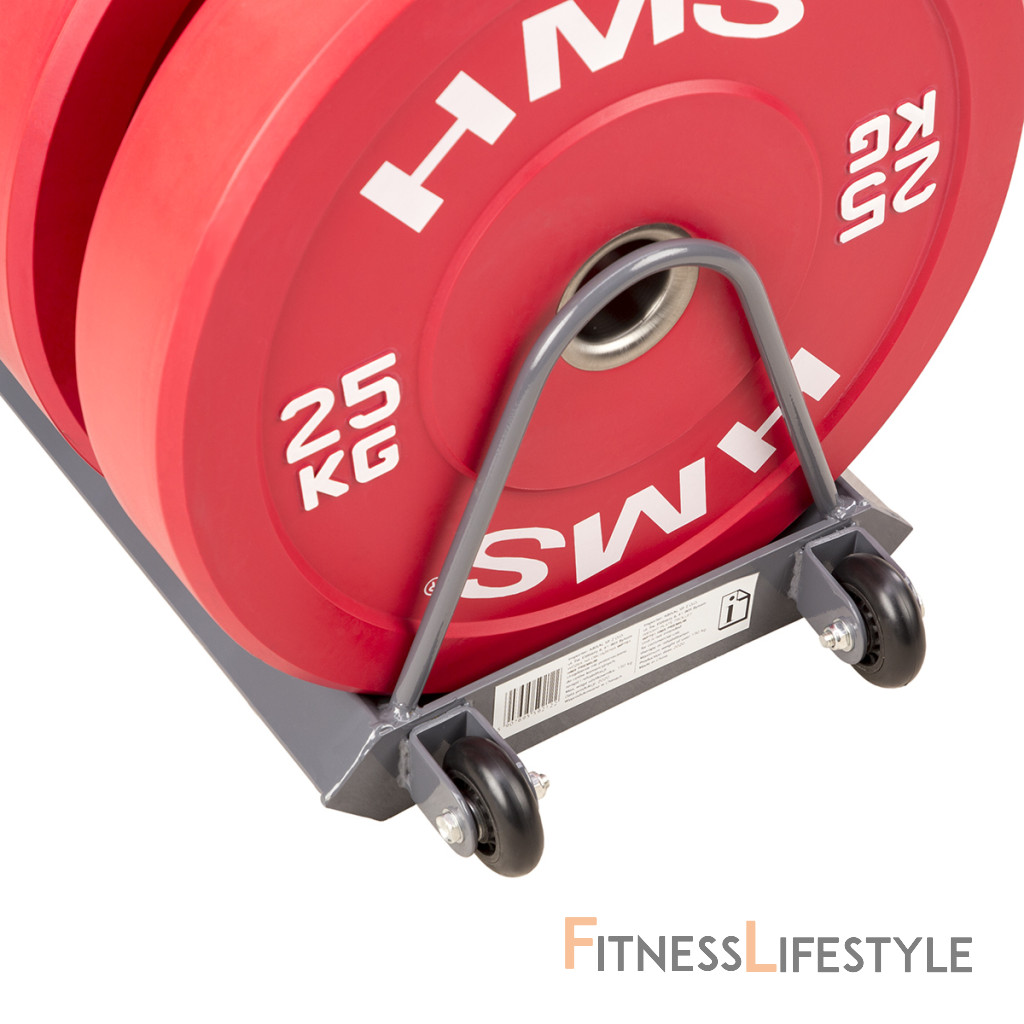 Stojan / vozík na závažie HMS Premium WPT01 je je vyrobený z kvalitnej ocele a môžete ho zaťažiť až 250-tich kilogramy. Konštrukcia vozíka WPT01 disponuje 16-tich pozíciami pre odloženie olympisjkých kotúčov, môžete doň teda vyskladať celú sadu závaží. Šírka jednotlivých pozícií v smere od transportných koliesok sú odstupňované vždy po dvoch a to konkrétne 2 x 11 cm, 2 x 9 cm, 2 x 7 cm, 2 x 5,5 cm, 2 x 3,5 cm, 2 x 4,5 cm, 2 x 4 cm a 2 x 3,5 cm. Transportné kolieska a pohodlné madlo umožňujú ľahké presúvanie celej sady závažia podľa aktuálnych potrieb.