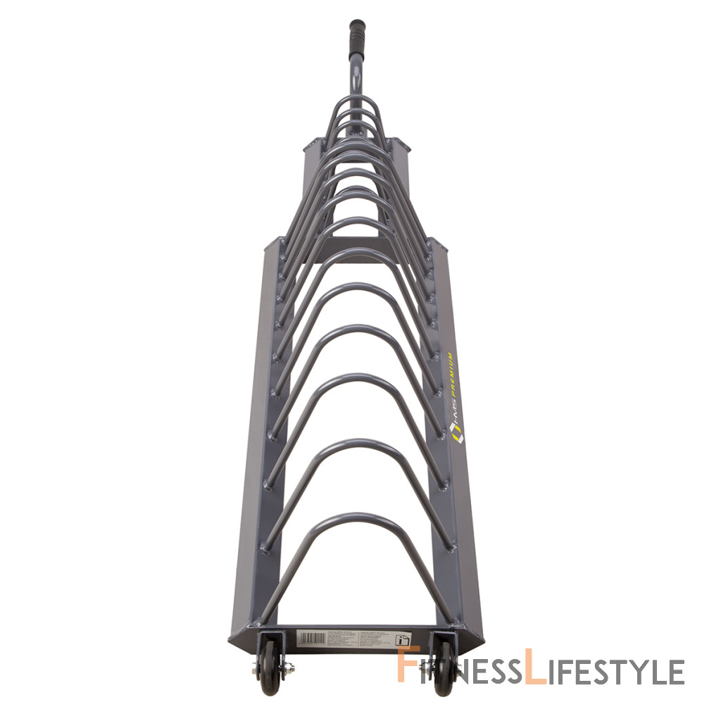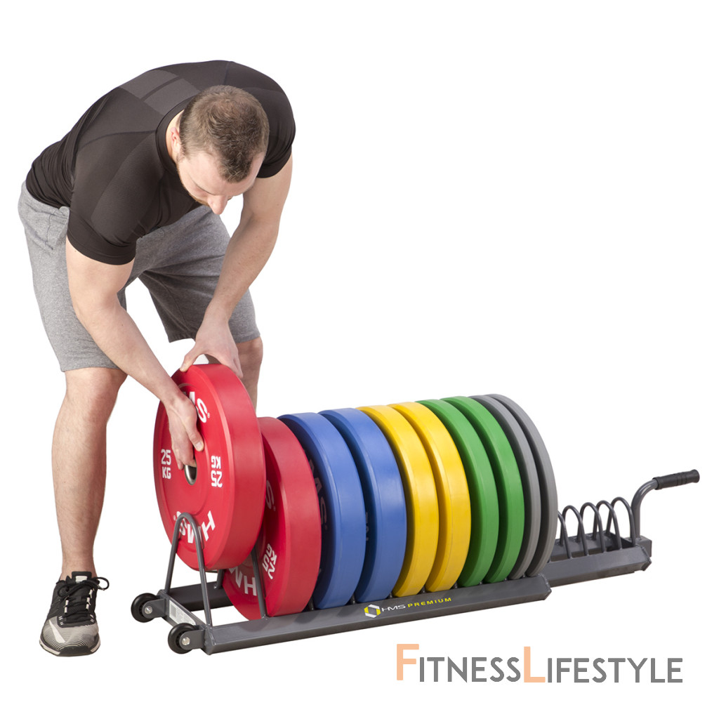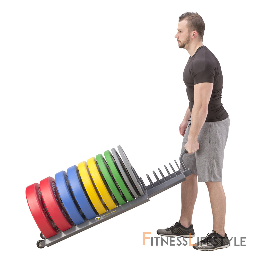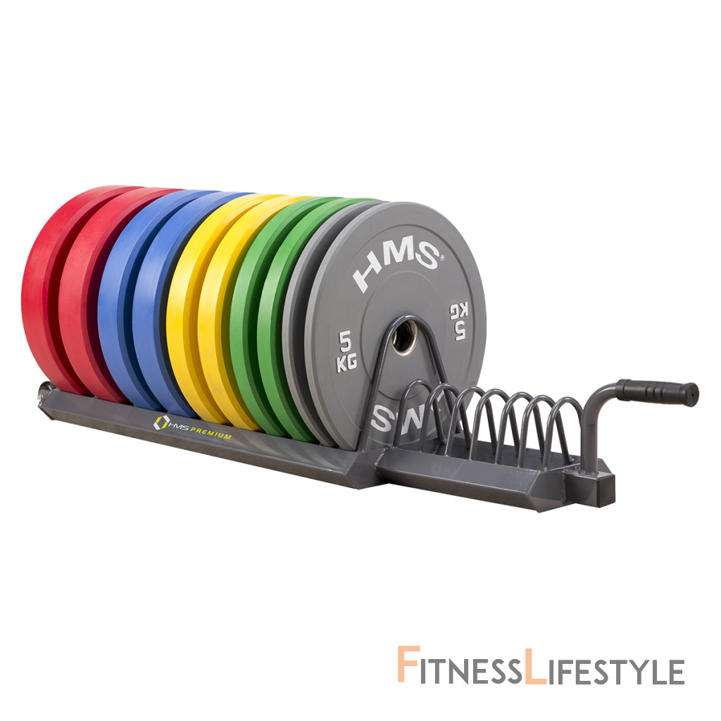 Stojan / vozík na závažie HMS Premium WPT01 je je vyrobený z kvalitnej ocele a môžete ho zaťažiť až 250-tich kilogramy. Konštrukcia vozíka WPT01 disponuje 16-tich pozíciami pre odloženie olympisjkých kotúčov, môžete doň teda vyskladať celú sadu závaží. Šírka jednotlivých pozícií v smere od transportných koliesok sú odstupňované vždy po dvoch a to konkrétne 2 x 11 cm, 2 x 9 cm, 2 x 7 cm, 2 x 5,5 cm, 2 x 3,5 cm, 2 x 4,5 cm, 2 x 4 cm a 2 x 3,5 cm. Transportné kolieska a pohodlné madlo umožňujú ľahké presúvanie celej sady závažia podľa aktuálnych potrieb.