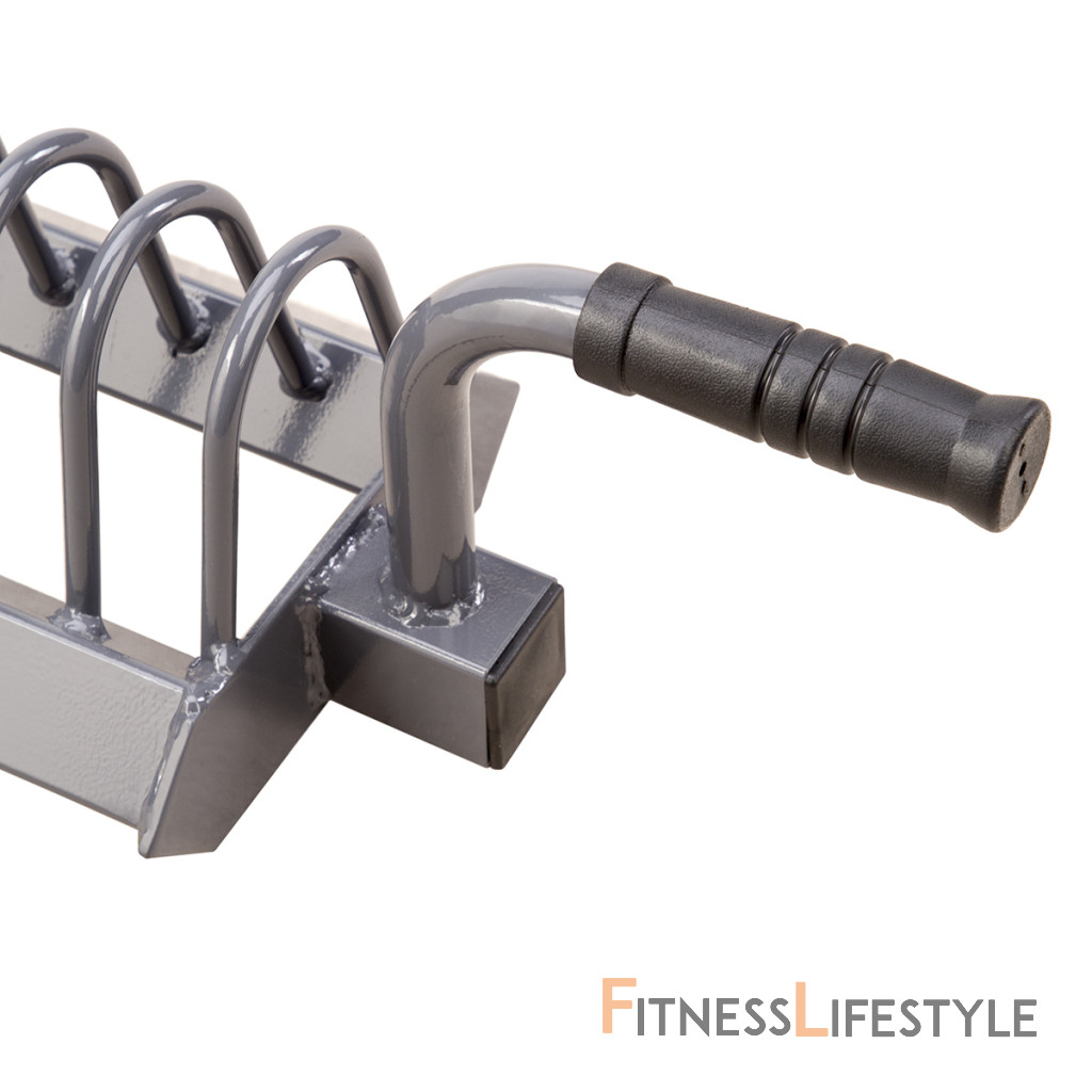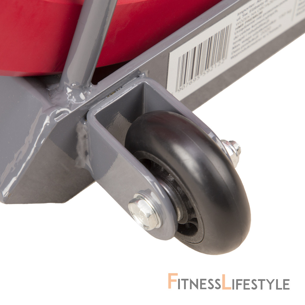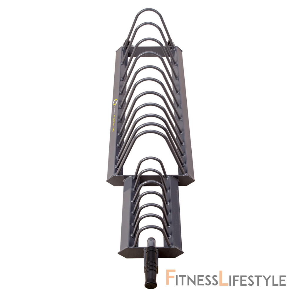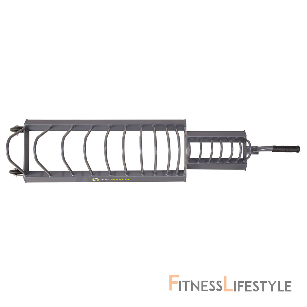 Stojan / vozík na závažie HMS Premium WPT01 je je vyrobený z kvalitnej ocele a môžete ho zaťažiť až 250-tich kilogramy. Konštrukcia vozíka WPT01 disponuje 16-tich pozíciami pre odloženie olympisjkých kotúčov, môžete doň teda vyskladať celú sadu závaží. Šírka jednotlivých pozícií v smere od transportných koliesok sú odstupňované vždy po dvoch a to konkrétne 2 x 11 cm, 2 x 9 cm, 2 x 7 cm, 2 x 5,5 cm, 2 x 3,5 cm, 2 x 4,5 cm, 2 x 4 cm a 2 x 3,5 cm. Transportné kolieska a pohodlné madlo umožňujú ľahké presúvanie celej sady závažia podľa aktuálnych potrieb.