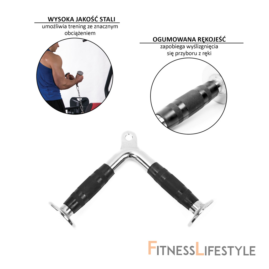 Tricepsový adaptér tvare V HMS UW06 je vhodným doplnkom pre kladkové posilňovacie stroje. Gumové rukoväte s protišmykovým povrchom pomôže konfortnímu cvičenia.