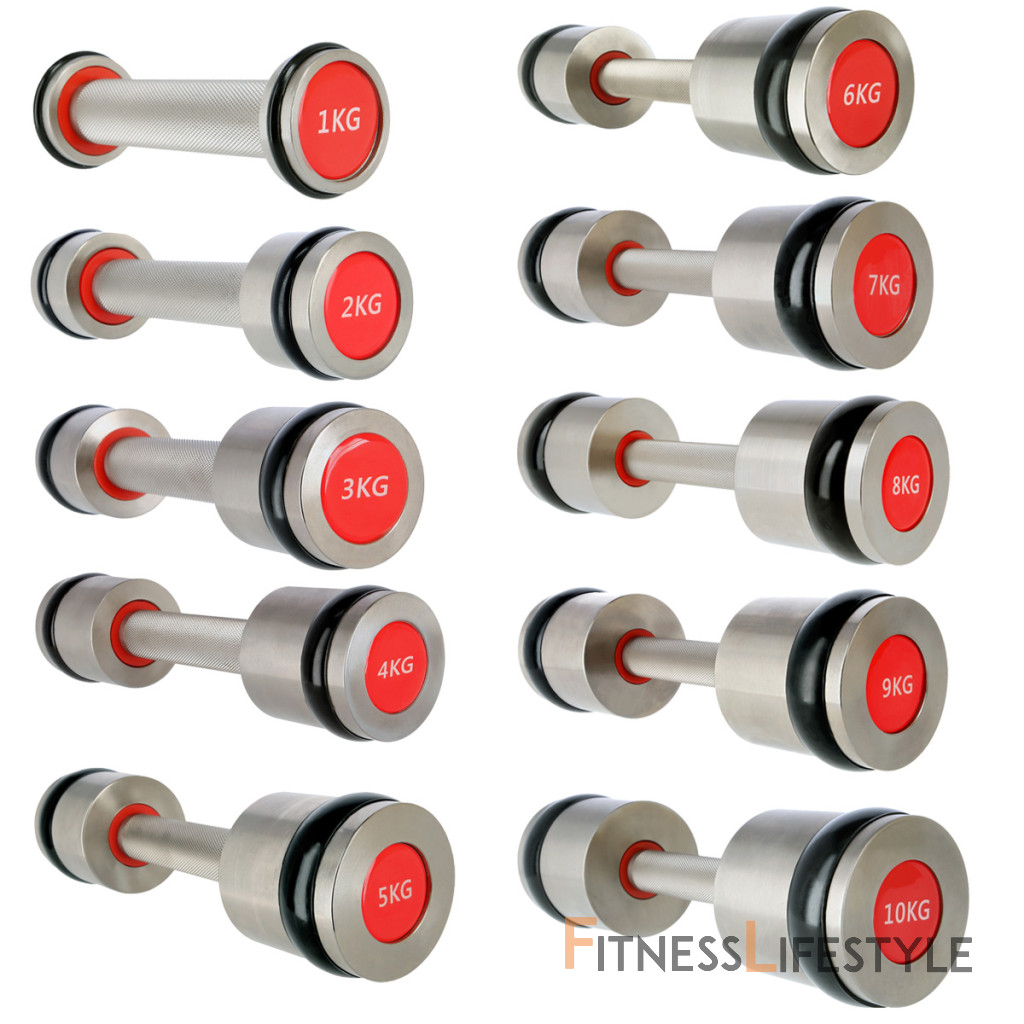 Kvalitná chrómová oceľ sa používa ako materiál, ktorý zaručuje dlhú životnosť, odolnosť proti poškodeniu a zabraňuje oxidácii. Činky sú vybavené mriežkou rukoväťou pre pevnú a určitú priľnavosť. Predĺžená časť činiek je navlečená silikónovým krúžkom, ktorý chráni činku a podlahu pred poškodením.