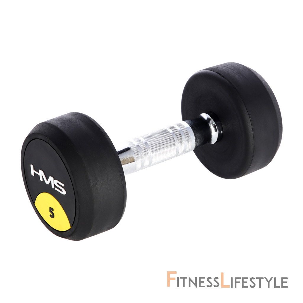 5-tich kilogramová jednoručná činka HMS HG Pro je určená pre profesionálne použitie ako doma tak v posilňovni. Závažie tvorí liatinový odliatok pokrytý hrubou vrstvou gumy, ktorá ochráni ako činku, tak podklad pred poškodením. Na čelnej strane je značka HMS a údaj o hmotnosti v kilogramoch. Rukoväť je vyrobená z chrómovanej ocele, pre pohodlný úchop má súdkovitý tvar s vrúbkovaným povrchom.