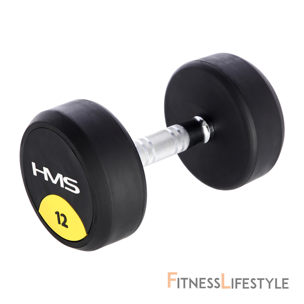 12-tich kilogramová jednoručná činka HMS HG Pro je určená pre profesionálne použitie ako doma tak v posilňovni. Závažie tvorí liatinový odliatok pokrytý hrubou vrstvou gumy, ktorá ochráni ako činku, tak podklad pred poškodením. Na čelnej strane je značka HMS a údaj o hmotnosti v kilogramoch. Rukoväť je vyrobená z chrómovanej ocele, pre pohodlný úchop má súdkovitý tvar s vrúbkovaným povrchom.