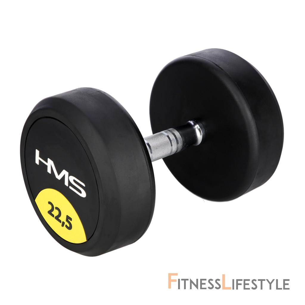 22,5 kilogramová jednoručná činka HMS HG Pro je určená pre profesionálne použitie ako doma tak v posilňovni. Závažie tvorí liatinový odliatok pokrytý hrubou vrstvou gumy, ktorá ochráni ako činku, tak podklad pred poškodením. Na čelnej strane je značka HMS a údaj o hmotnosti v kilogramoch. Rukoväť je vyrobená z chrómovanej ocele, pre pohodlný úchop má súdkovitý tvar s vrúbkovaným povrchom.