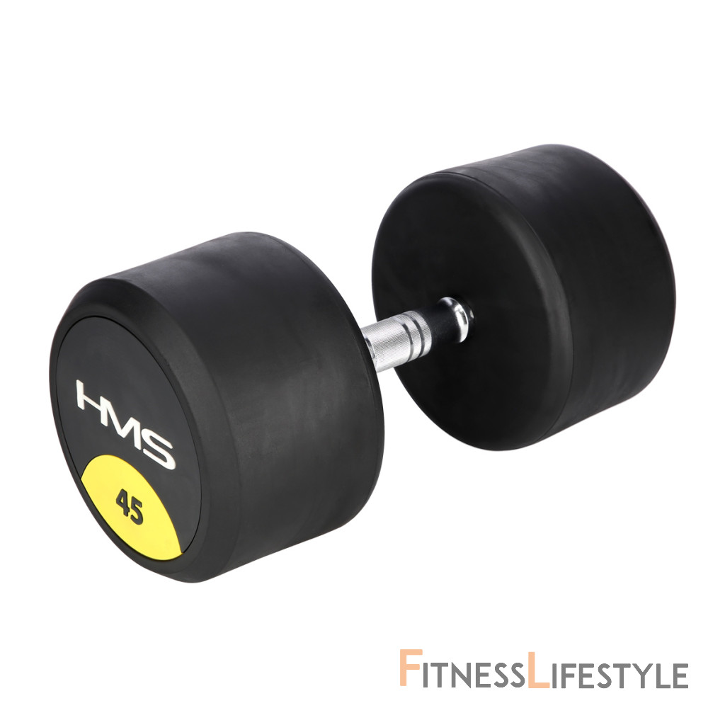 45-tich kilogramová jednoručná činka HMS HG Pro je určená pre profesionálne použitie ako doma tak v posilňovni. Závažie tvorí liatinový odliatok pokrytý hrubou vrstvou gumy, ktorá ochráni ako činku, tak podklad pred poškodením. Na čelnej strane je značka HMS a údaj o hmotnosti v kilogramoch. Rukoväť je vyrobená z chrómovanej ocele, pre pohodlný úchop má súdkovitý tvar s vrúbkovaným povrchom.