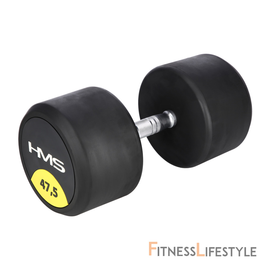 47,5 kilogramová jednoručná činka HMS HG Pro je určená pre profesionálne použitie ako doma tak v posilňovni. Závažie tvorí liatinový odliatok pokrytý hrubou vrstvou gumy, ktorá ochráni ako činku, tak podklad pred poškodením. Na čelnej strane je značka HMS a údaj o hmotnosti v kilogramoch. Rukoväť je vyrobená z chrómovanej ocele, pre pohodlný úchop má súdkovitý tvar s vrúbkovaným povrchom.