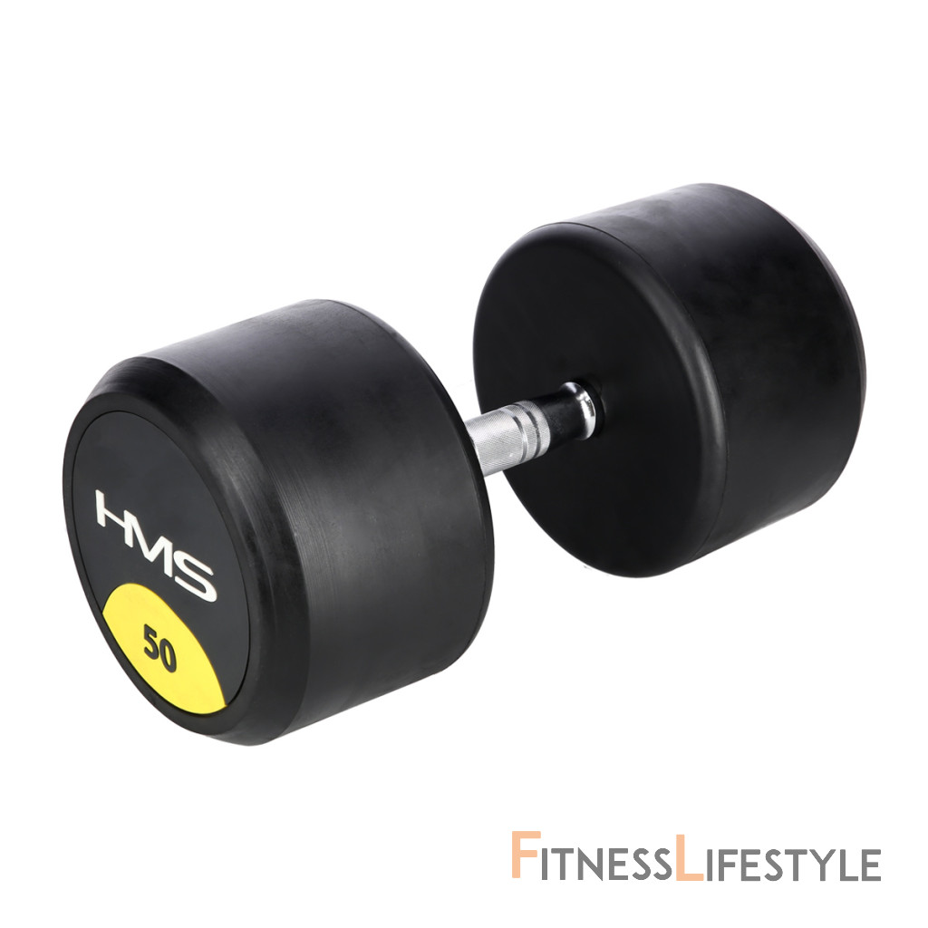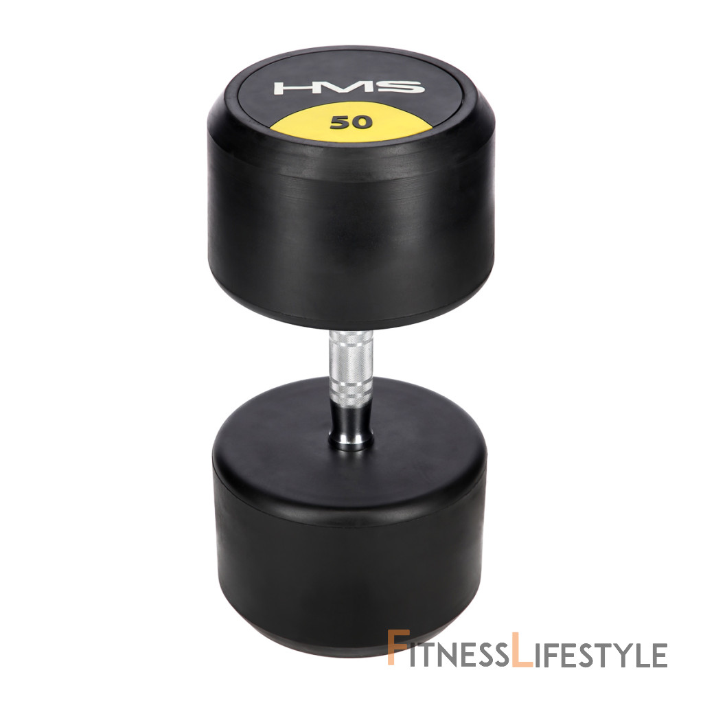 50-tich kilogramová jednoručná činka HMS HG Pro je určená pre profesionálne použitie ako doma tak v posilňovni. Závažie tvorí liatinový odliatok pokrytý hrubou vrstvou gumy, ktorá ochráni ako činku, tak podklad pred poškodením. Na čelnej strane je značka HMS a údaj o hmotnosti v kilogramoch. Rukoväť je vyrobená z chrómovanej ocele, pre pohodlný úchop má súdkovitý tvar s vrúbkovaným povrchom.