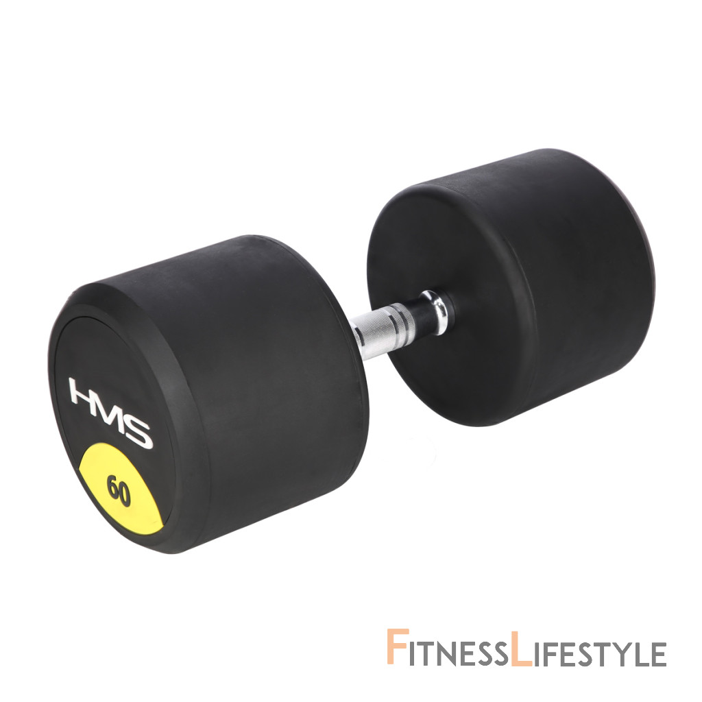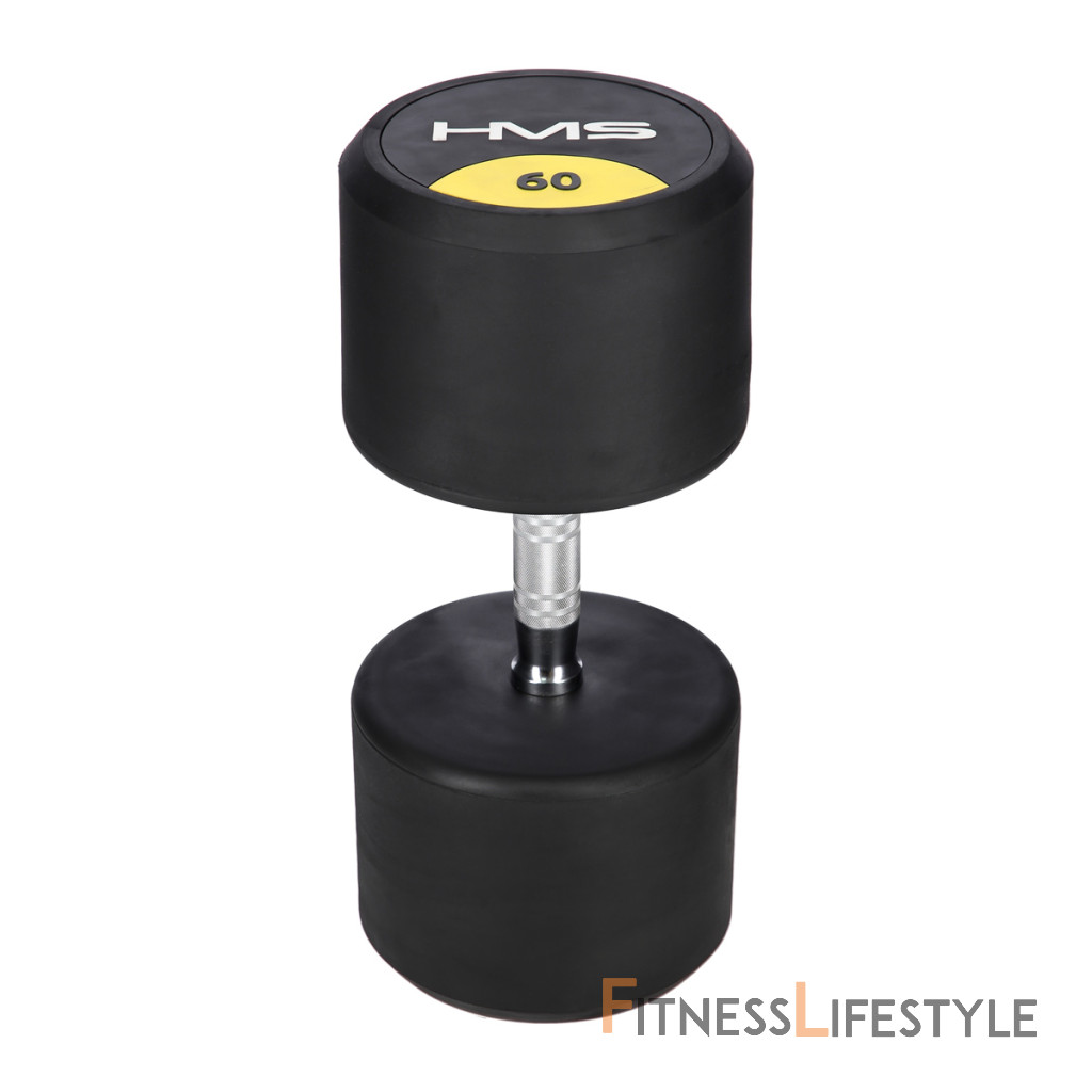 60-tich kilogramová jednoručná činka HMS HG Pro je určená pre profesionálne použitie ako doma tak v posilňovni. Závažie tvorí liatinový odliatok pokrytý hrubou vrstvou gumy, ktorá ochráni ako činku, tak podklad pred poškodením. Na čelnej strane je značka HMS a údaj o hmotnosti v kilogramoch. Rukoväť je vyrobená z chrómovanej ocele, pre pohodlný úchop má súdkovitý tvar s vrúbkovaným povrchom.