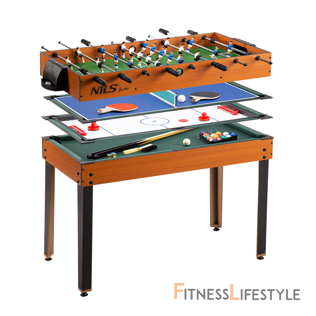 Multifunkčné herné stôl NILS SDM 4v1, ktorý obsahuje najobľúbenejšie hry ako je - futbal, biliard, air hokej a stolný tenis. To všetko na jednom mieste s jednoduchou výmenou herné dosky.