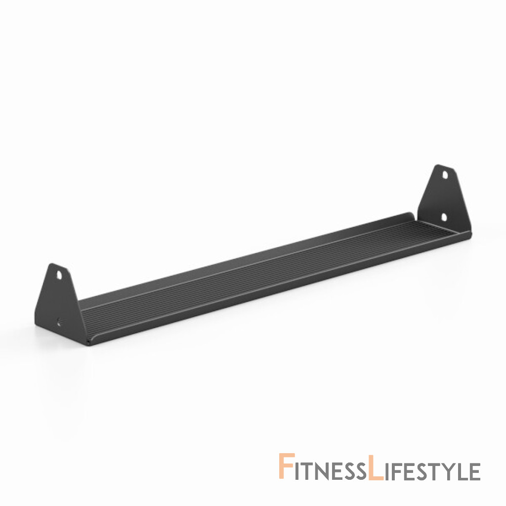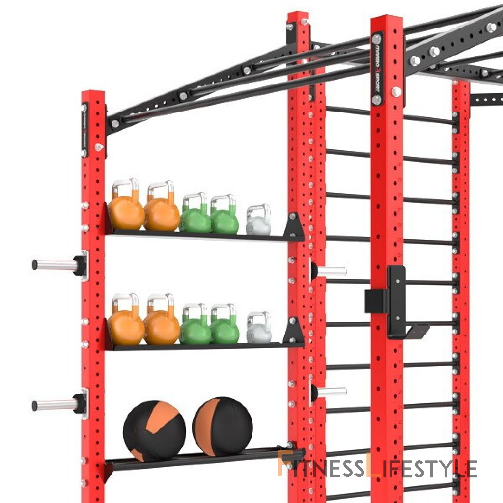 Police sa pripevnia k stojnám pomocou 4 ks dodávaných skrutiek. Po dotiahnutí je polica ideálna na odkladanie príslušenstva (kettlebelly, švihadlá,...).