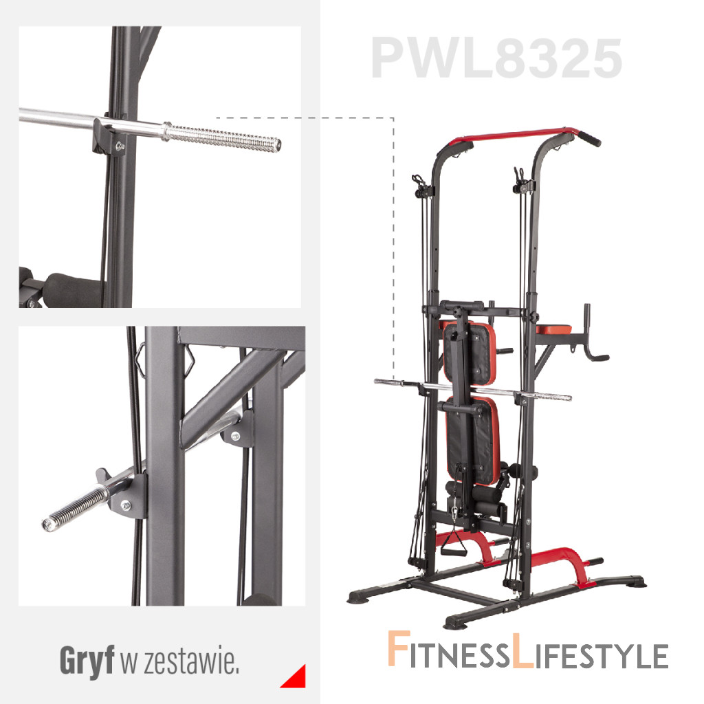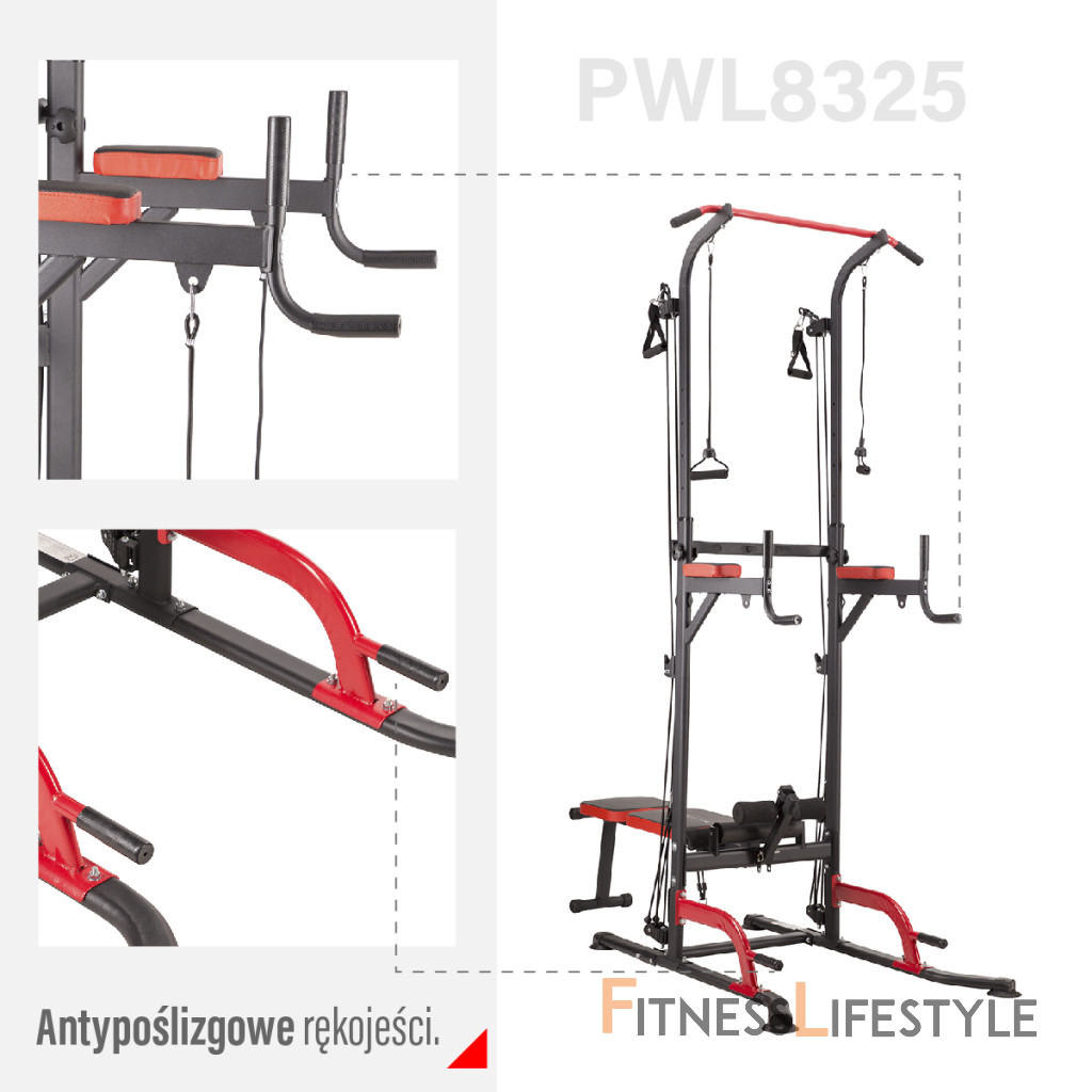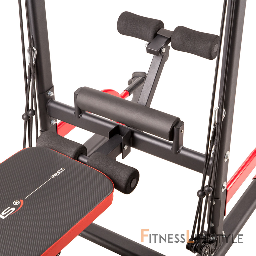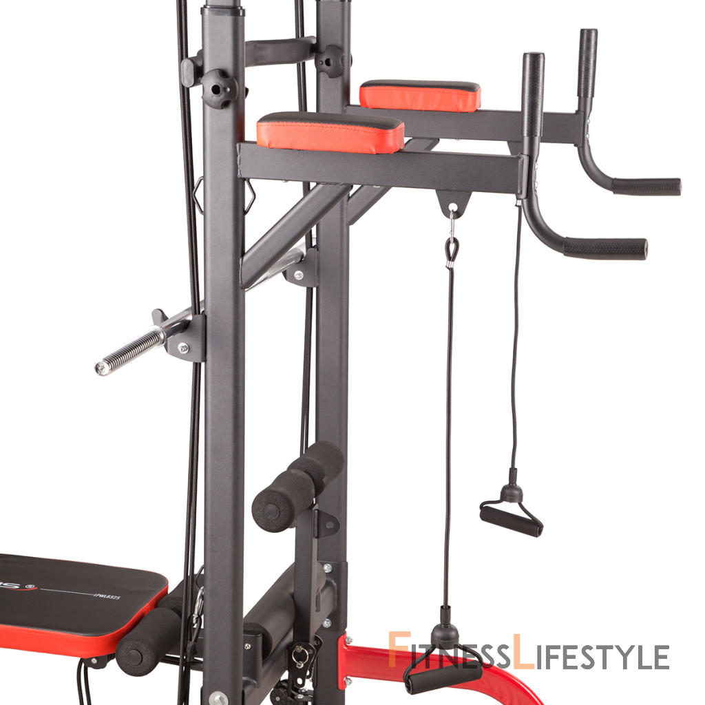 PWL8325 je vyrobená z najkvalitnejších materiálov. Všetky rukoväte sú potiahnuté protišmykovým materiálom, ktorý zaručuje pevný úchop pri cvičení. Hrazdu je možné výškovo nastaviť do 232 cm. Lavička sa dá sklopiť pre úsporu miesta.