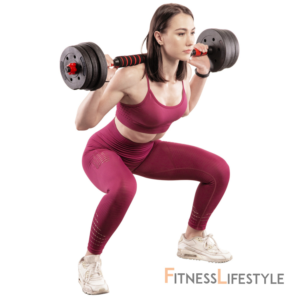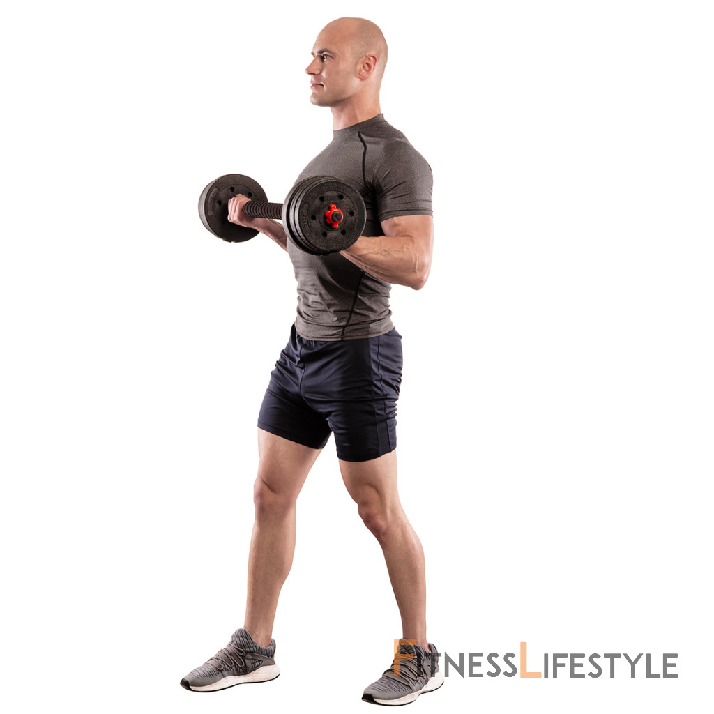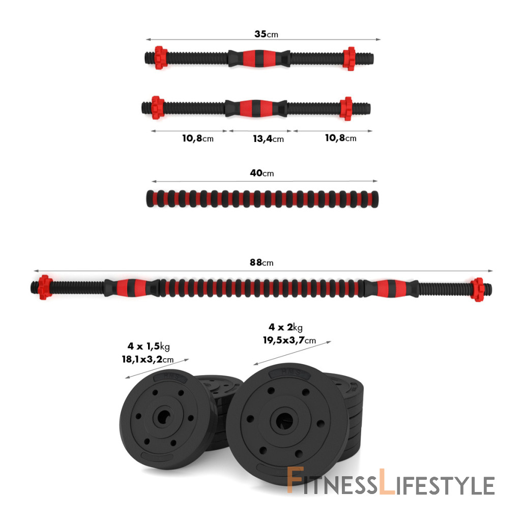 Kotúče sú vyrobené z tvrdého plastu, ktorý je vyplnený cementom. Obojručná os je spojovacím dielom, do ktorého sa vskrutkujú hriadele jednoručných činiek. Nakladacie tŕne sú opatrené závitom a závažie sa zaisťuje pomocou hviezdicových matíc.