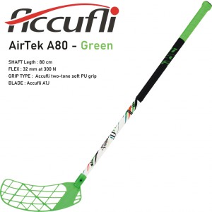 Florbalová hokejka Accufli AirTek A80 Green. Je dobre navrhnutá, precízne vyrobená a testovaná. Ponúka zväčšenú zónu pre presnosť strely, trvanlivosť, rovnováhu, atraktívny dizajn.