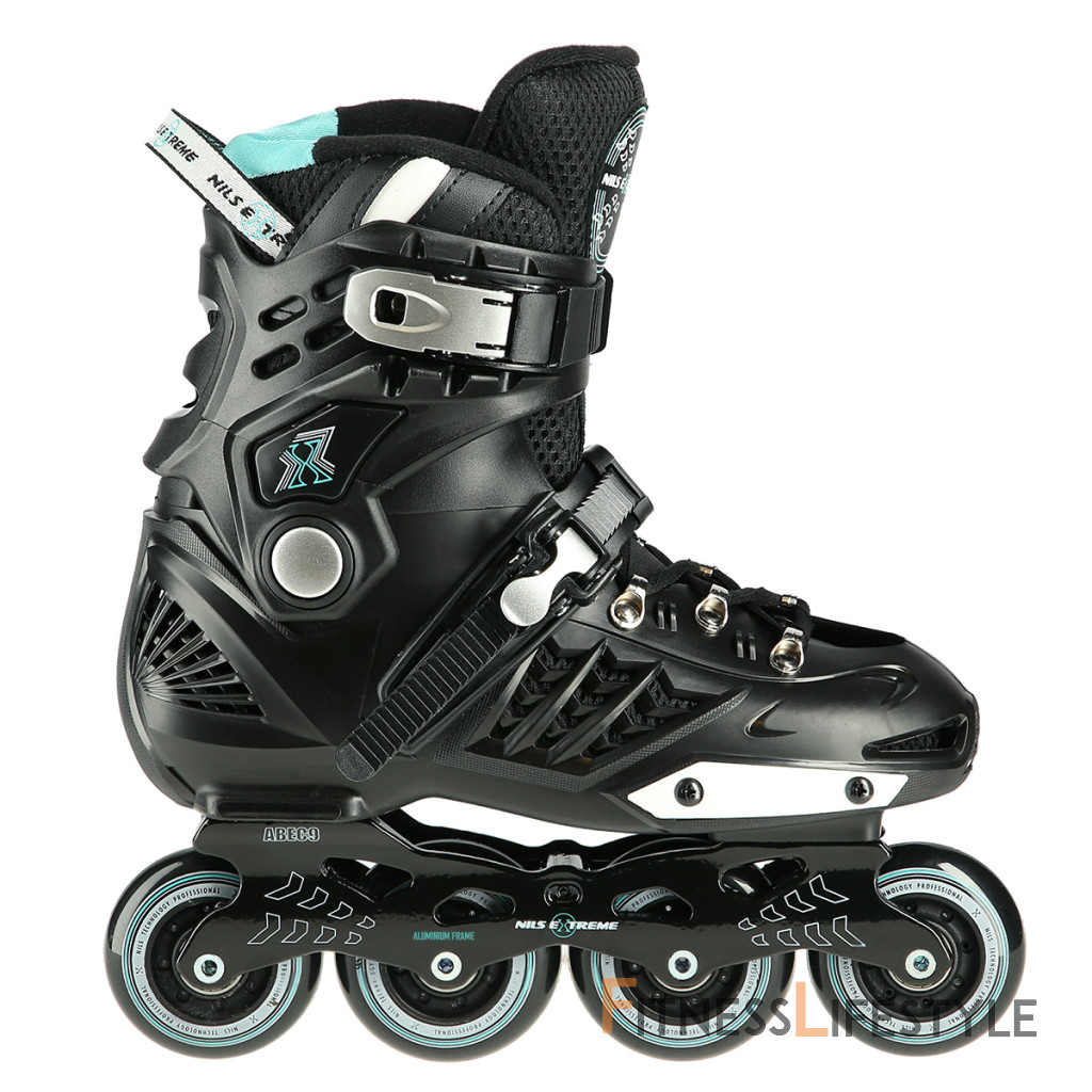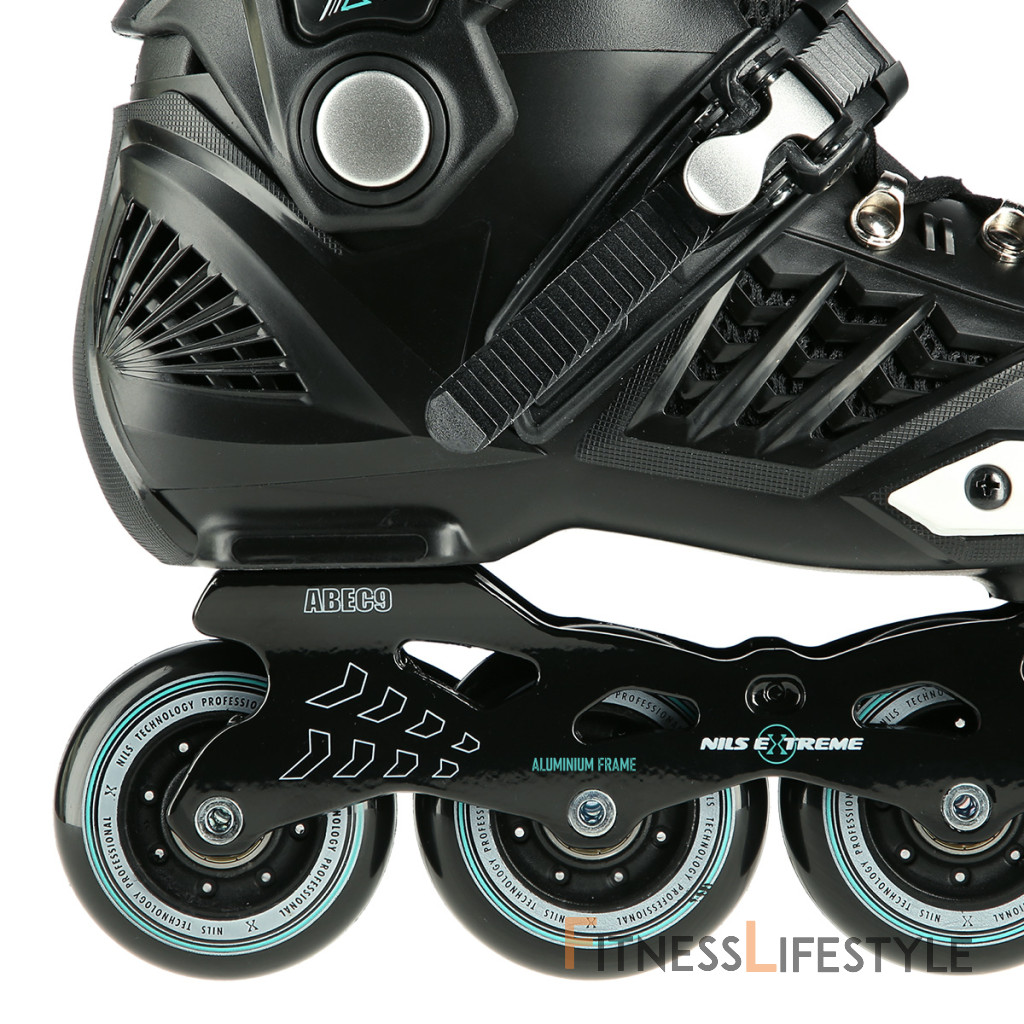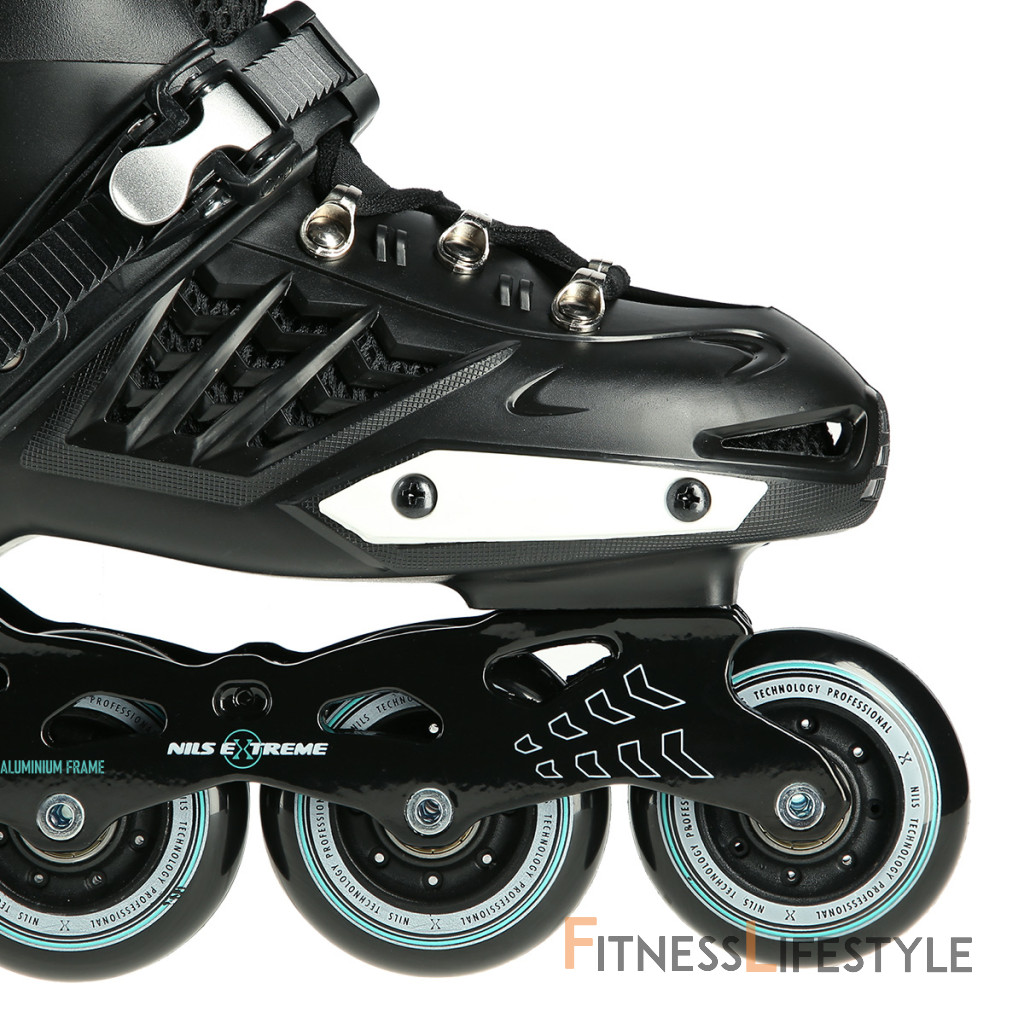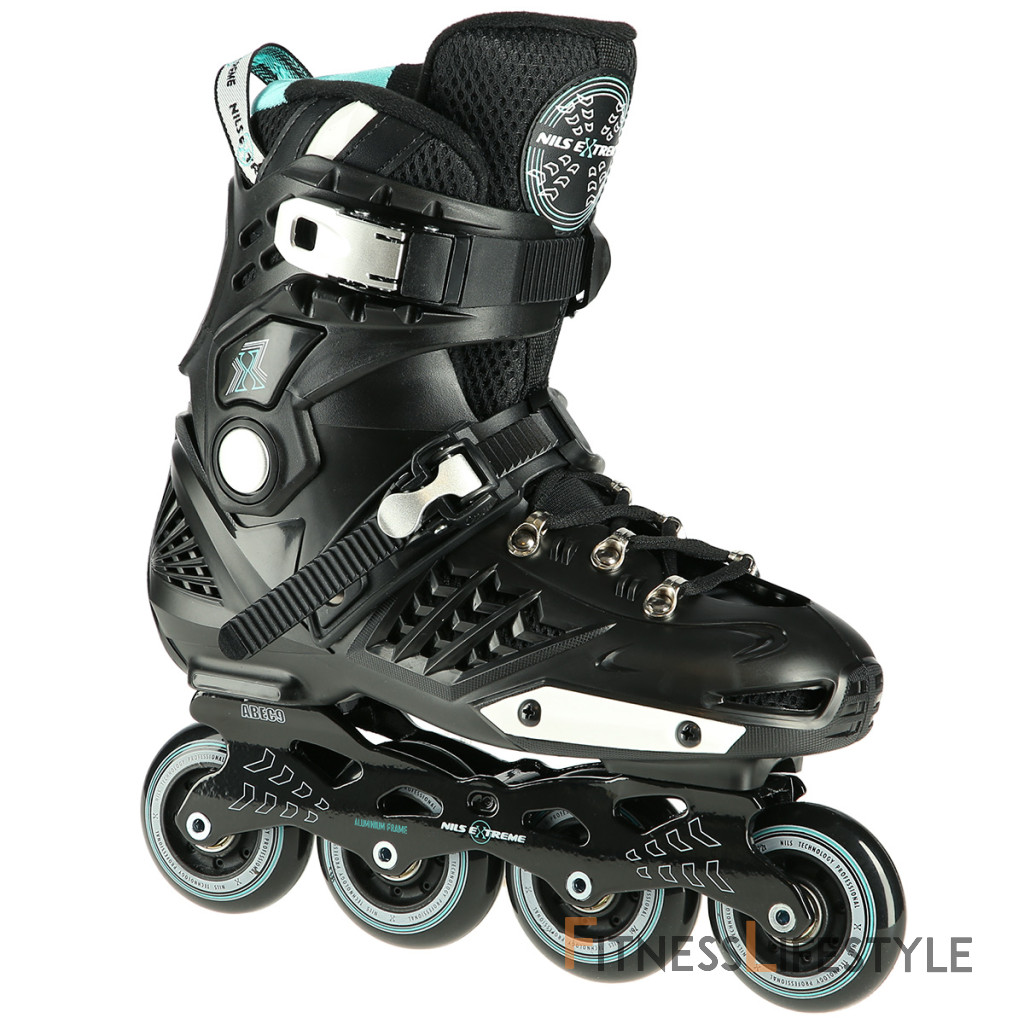 Kolieskové korčule NILS Extreme NA20001 sú určené primárne pre freeride a slalom. Ich konštrukcia je založená na ľahkej, vetranej topánke s anatomickou stielkou zaručujúcou vysokú stabilitu päty, polypropylénovom skelete a hliníkovej lište vyrobenej pomocou vstrekovania. Ako zapínanie bolo použité šnurovanie, dvojsekčné pracky a kvalitné spony s napínacím mechanizmom. Na vonkajšej strane topánky nájdeme slider, tak často používaný pri freeride.