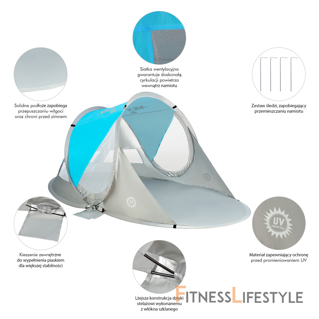 Plážový stan NILS Camp NC3143 BIG využijete nielen počas dovolenky pri mori, ale aj na verejnom kúpalisku, alebo pri bazéne na záhrade. Stan NC3143 sa okamžite rozloží, je odolný a funkčný, ale predovšetkým poskytne účinnú ochranu pred slnečnými lúčmi, poskytne tieň a zároveň úkryt pred vetrom. Hlavnou funkciou plážového stanu je ochrana pred slnečnými lúčmi a škodlivým UV žiarením. Model NC3143 odrazí až 96% UV žiarenia. Stan je dodávaný zložený v kruhovej taške opatrenej uchom pre ľahké prenášanie. Po vytiahnutí z tašky sa stan automaticky rozloží. Na zloženie sa použije jednoduché gesto a stan sa schová opäť do tašky. Podlaha s rozmermi 200 x 120 cm a výška 93 cm umožňujú úkryt pred slnkom ako deťom, tak rodičom. Podporná konštrukcia prístrešku je tvorená laminátovou tyčou. Na ňu je navlečená polyesterová plachta. Použitý materiál odolá aj malej, dažďovej prehánke. Parametre: Upozornenie: