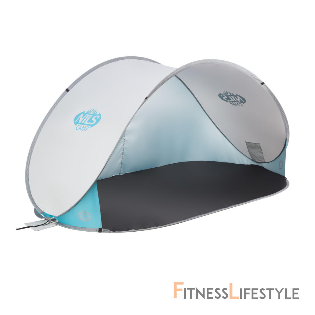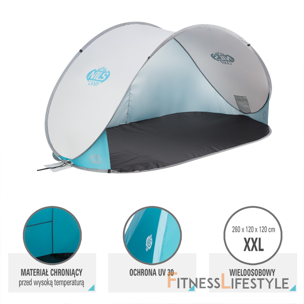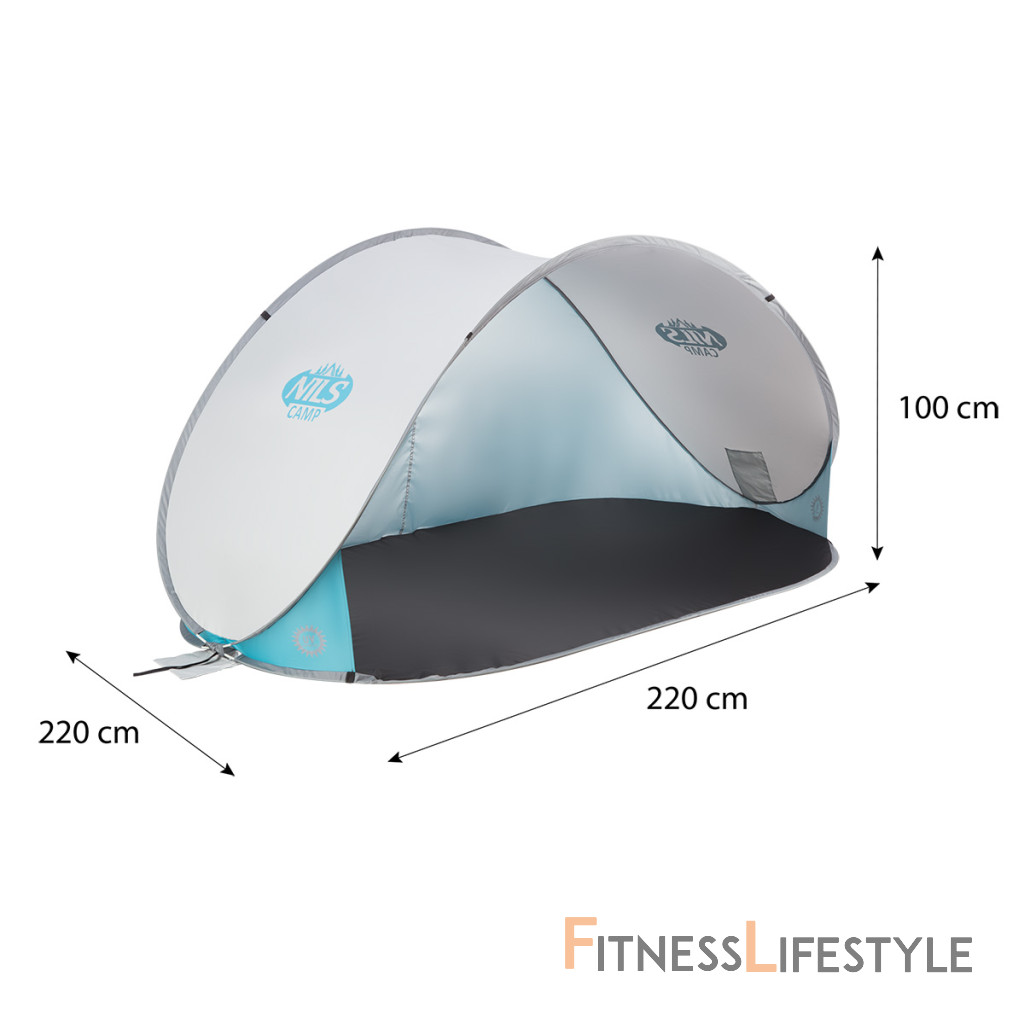 Plážový stan NILS Camp NC3174 využijete nielen počas dovolenky pri mori, ale aj na verejnom kúpalisku, alebo pri bazéne na záhrade. Hlavnou funkciou plážového stanu je ochrana pred slnečnými lúčmi a škodlivým UV žiarením. Model NC3174 odrazí až 96% UV žiarenia. Stan je dodávaný zložený v kruhovej taške opatrenej uchom pre ľahké prenášanie. Po vytiahnutí z tašky sa stan automaticky rozloží. Na zloženie sa použije jednoduché gesto a stan sa schová opäť do tašky. Podlaha s rozmermi 120 x 220 cm a výška 100 cm umožňujú úkryt pred slnkom ako deťom, tak rodičom. Podporná konštrukcia prístrešku je tvorená sklo-laminátovou tyčou. Na ňu je navlečená polyesterová plachta. Použitý materiál odolá aj malej, dažďovej prehánke.