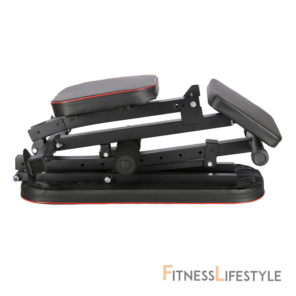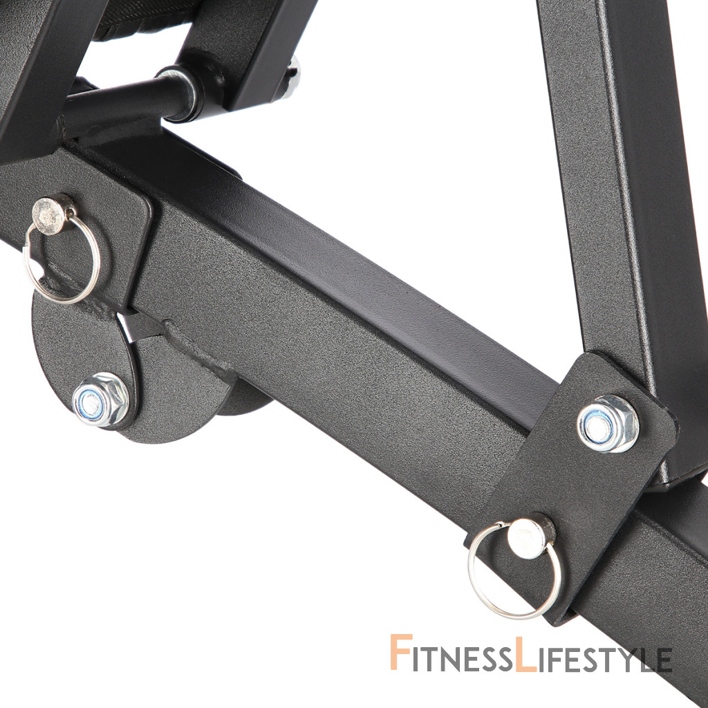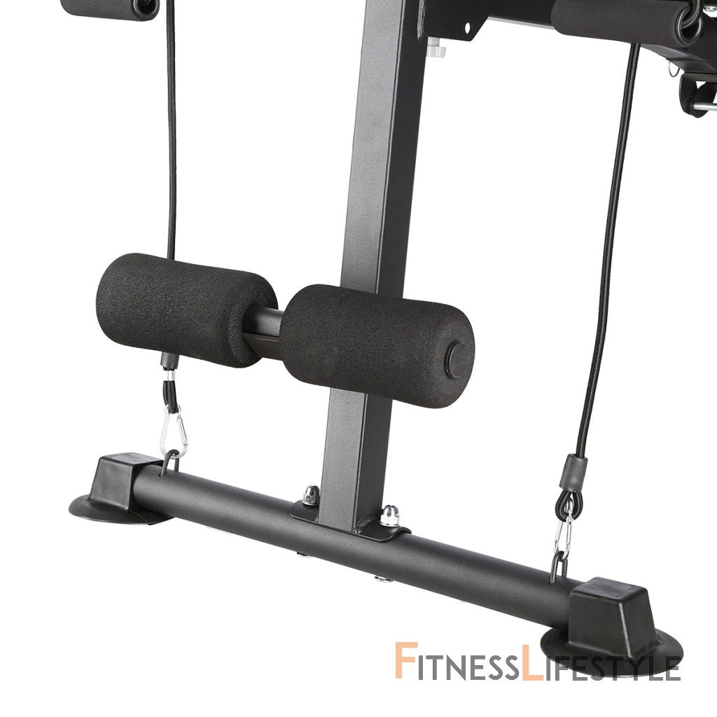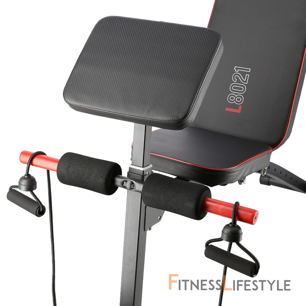 Oceľová konštrukcia má nosnosť 150 kilogramov a dá sa ľahko zložiť, takže nezaberie veľa miesta, pokiaľ lavicu práve nepoužívate. Hmotnosť L8021 je 9,5 kilogramov. Sedák a podpery sú potiahnuté odolnou, syntetickou kožou s protišmykovým povrchom. Chrbtová opora je nastaviteľná do 7-mich polôh v rozsahu od -20 ° do 90 °. Bicepsovú opierku je možné výškovo nastaviť do 2 polôh. Stabilizátory lavice sú osadené gumovými koncovkami, ktoré lavicu udržia pevne na svojom mieste. Na prednej nohe sa nachádzajú pútka na zaháčanie dodávaných gumových lán pre tréning paží.