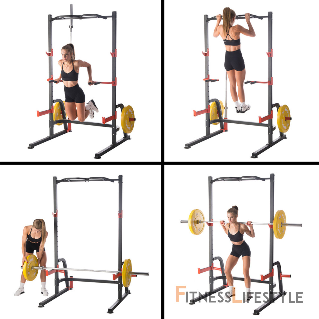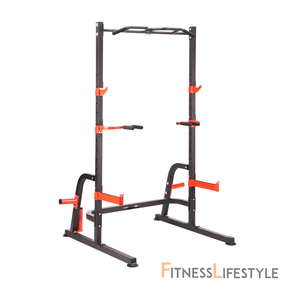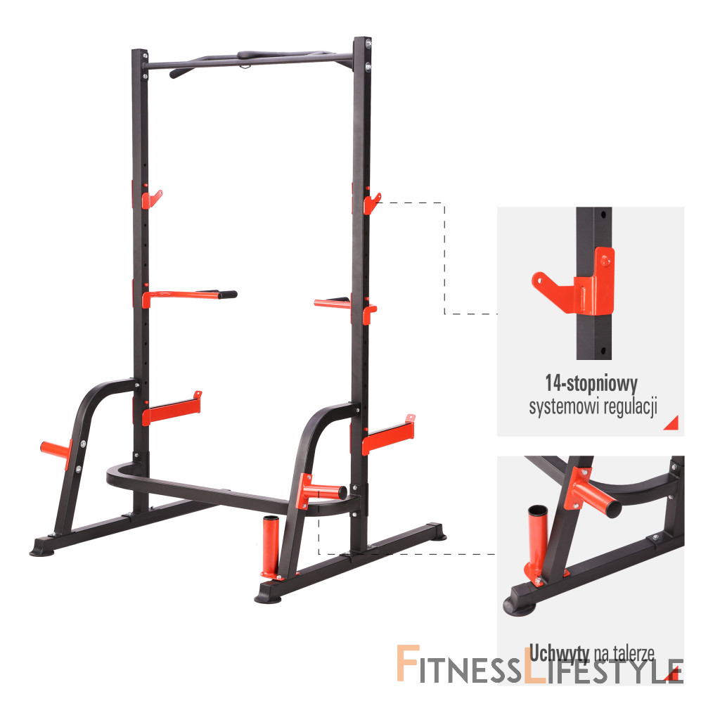 Celá konštrukcia je vyrobená z ocele, vďaka čomu je trvanlivá a odolná, rozmerná základňa umožňuje dynamický tréning aj pri veľkom zaťažení. Maximálna nosnosť stojana je 200 kg. Voľné závažie je možné odkladať na 2 tŕne s dĺžkou 16 centimetrov. Podpery pre dipy majú dvojité madlá a umožňujú prispôsobenie správnej polohy pre tréning. Tvarovaná hrazda ponúka 4 páry rôznych úchopov. Stabilizátory sú osadené koncovkami, ktoré chránia konštrukciu a podlahu pred poškodením a zároveň zvyšujú stabilitu stojana.