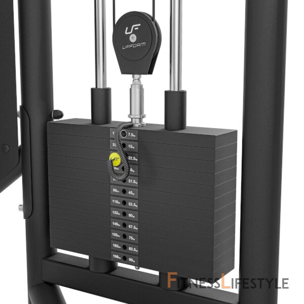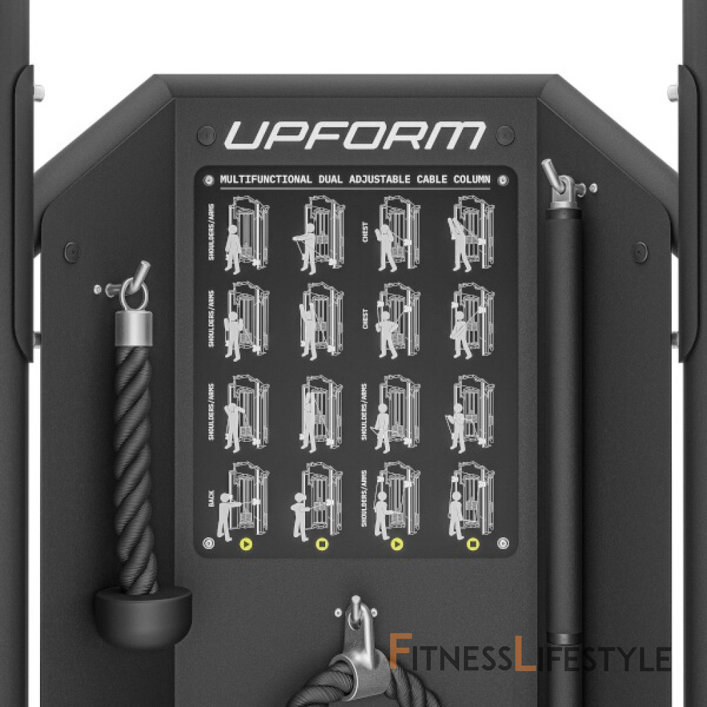 UpForm UF-019 má 2 samostatné kladky nastaviteľné do 18-tich úrovní výšky, tieto úrovne sú číslované pre rýchle a symetrické nastavenie oboch kladiek. Zmena výšky sa vykonáva zatiahnutím za pružinový kolík a posuvom kladky pomocou madla. Samotné kladky sú otočné v uhle 180 ° pre maximálny rozsah použitia. Každá kladka je spojená oceľovým lanom so zásobníkom závažia s 12 tehlami s hmotnosťou 7,5 kilogramov, každá strana má teda k dispozícii 90 kilogramov záťaže. Jednotlivé závažia sú opatrené nálepkou pre rýchlu voľbu požadovanej záťaže ako v kilogramoch, tak v librách. Čap na výber hmotnosti je vyrobený z hliníka a je pripevnený ku krútenému lanku, takže nehrozí jeho strata. Pre jemnú úpravu záťaže sú súčasťou stanice 2 voľné tehly s hmotnosťou 3,75 kilogramov, ktoré sa pokladajú na prvú tehlu v zásobníku.