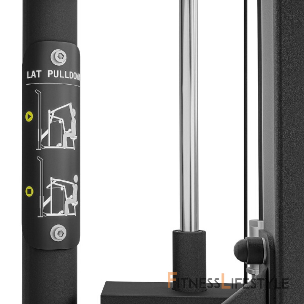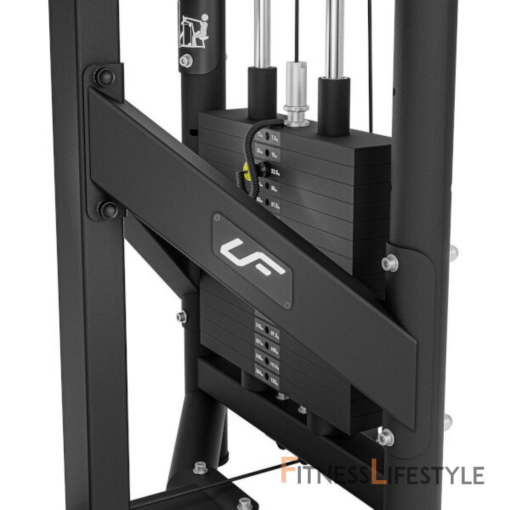 Sťahovanie hornej kladky UpForm UF-020 je profesionálna tréningová veža určená pre náročných užívateľov. Vďaka šikovnému dizajnu, veľkosti zásobníka a okamžitej zmene záťaže je veža ideálna pre silový a športový tréning. Konštrukciou je stanica určená na použitie v komerčných posilňovniach, fitnesscentrách alebo kluboch. Rám je vyrobený z oceľových profilov 100 x 60 x 3 milimetre a oceľových trubiek s profilom 60,3 x 3,2 mm a 76,1 x 3,2 milimetrov, ktoré zaručujú vysokú stabilitu konštrukcie a jej dlhú životnosť aj pri náročnom trénovaní s plne využívanou sadou závaží.