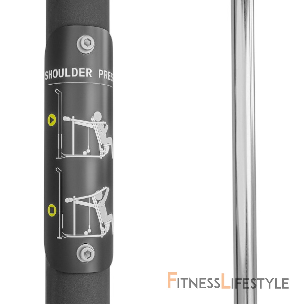 Shoulder Press, čiže tlaky na ramená UpForm UF-024 je profesionálna tréningová veža určená pre náročných užívateľov. Vďaka šikovnému dizajnu, veľkosti zásobníka a okamžitej zmene záťaže je veža ideálna pre silový a športový tréning. Konštrukciou je stanica určená na použitie v komerčných posilňovniach, fitnesscentrách alebo kluboch. Rám je vyrobený z oceľových profilov 100 x 60 x 3 milimetre a oceľových trubiek s profilom 60,3 x 3,2 mm a 76,1 x 3,2 milimetrov, ktoré zaručujú vysokú stabilitu konštrukcie a jej dlhú životnosť aj pri náročnom trénovaní s plne využívanou sadou závaží.