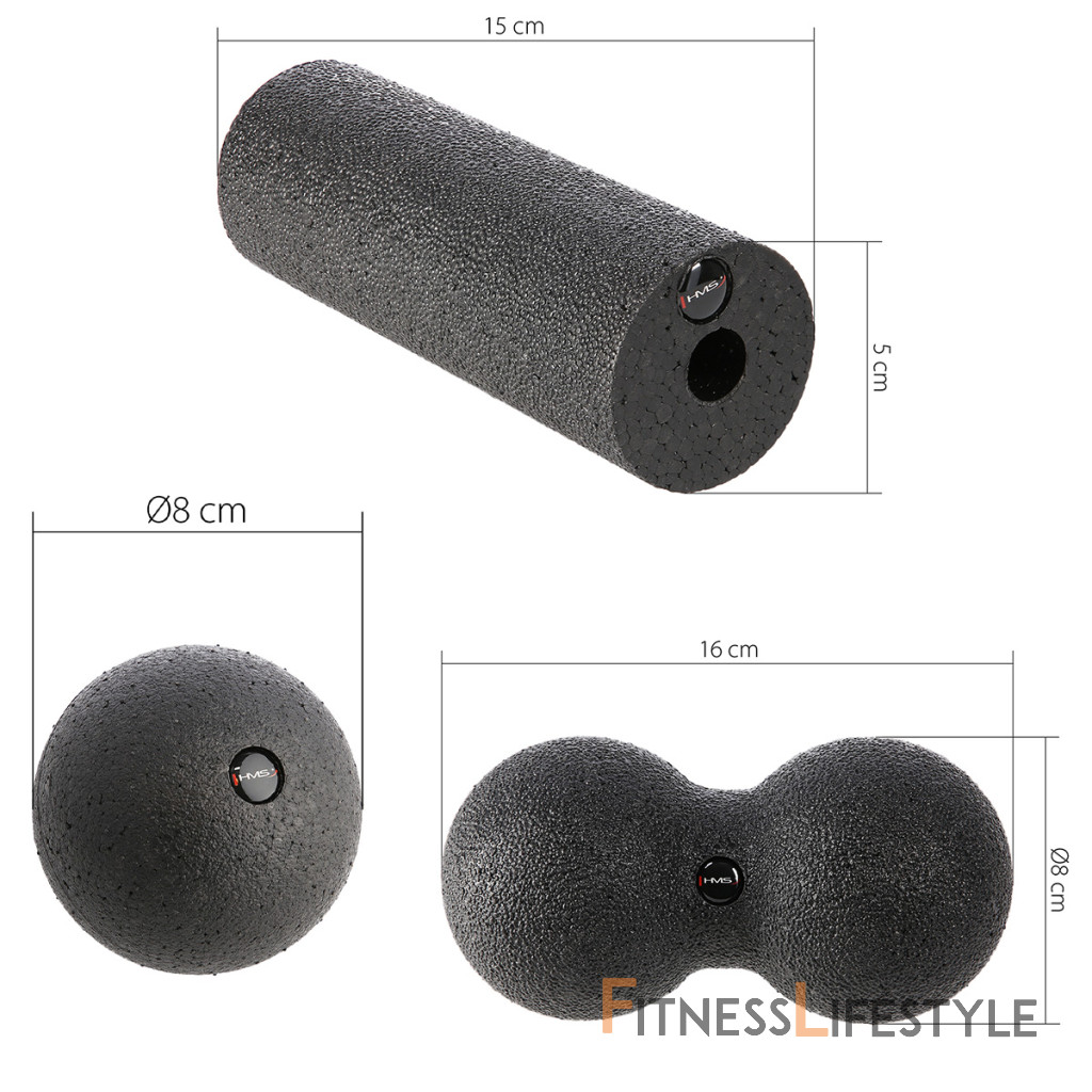 Masážna súprava HMS FSBM07 je dokonalým nástrojom na automasáž, ktorý obsahuje všetko pre udržanie zdravia vášho tela. Malá loptička s priemerom 8 cm je presne to, čo potrebujete na masáž spúšťových bodov a miest s napätými fasciami. Dvojitá lopta HMS je ideálna pre terapiu hlbokých svalových skupín alebo ťažko prístupných oblastí tela, ako je krk, zadok, ramená a hrudník. S mini valčekom si môžete uvoľniť predlaktia alebo chodidlá.