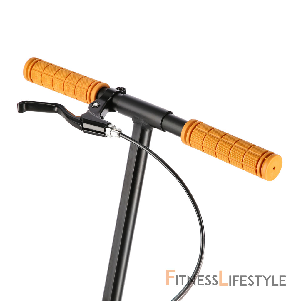 Zadný blatník slúži ako prítlačná brzda, ktorá ešte podčiarkuje brzdný účinok mechanickej brzdy ovládanej lankom z páčky na riadidlách, tie sú opatrené gumovými rukoväťami, ktoré zaisťujú pevný a pohodlný úchop. Riadidlá sú výškovo nastaviteľné do 3 úrovní. Veľké kolesá sú osadené ložiskami ABEC 7 a polyuretánovou pneumatikou s priemerom 200 milimetrov. Táto kombinácia zaisťuje rýchlu, plynulú a bezpečnú jazdu.