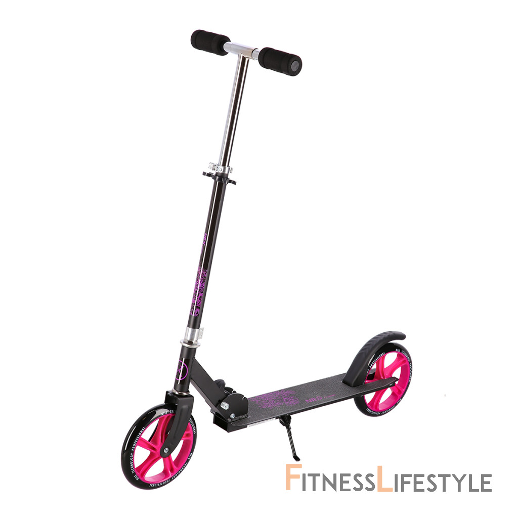 Zadný blatník slúži ako nášľapná brzda. Sklopné riadidlá sú opatrené penovými rukoväťami, ktoré zaisťujú pevný a pohodlný úchop. Riadidlá sú výškovo nastaviteľné do 3 úrovní. Veľké kolesá sú osadené ložiskami ABEC 7 a polyuretánovou pneumatikou s priemerom 200 milimetrov. Táto kombinácia zaisťuje rýchlu, plynulú a bezpečnú jazdu. Sklopný stojan umožňuje postavenie kolobežky, takže ju nie je potrebné pokladať.