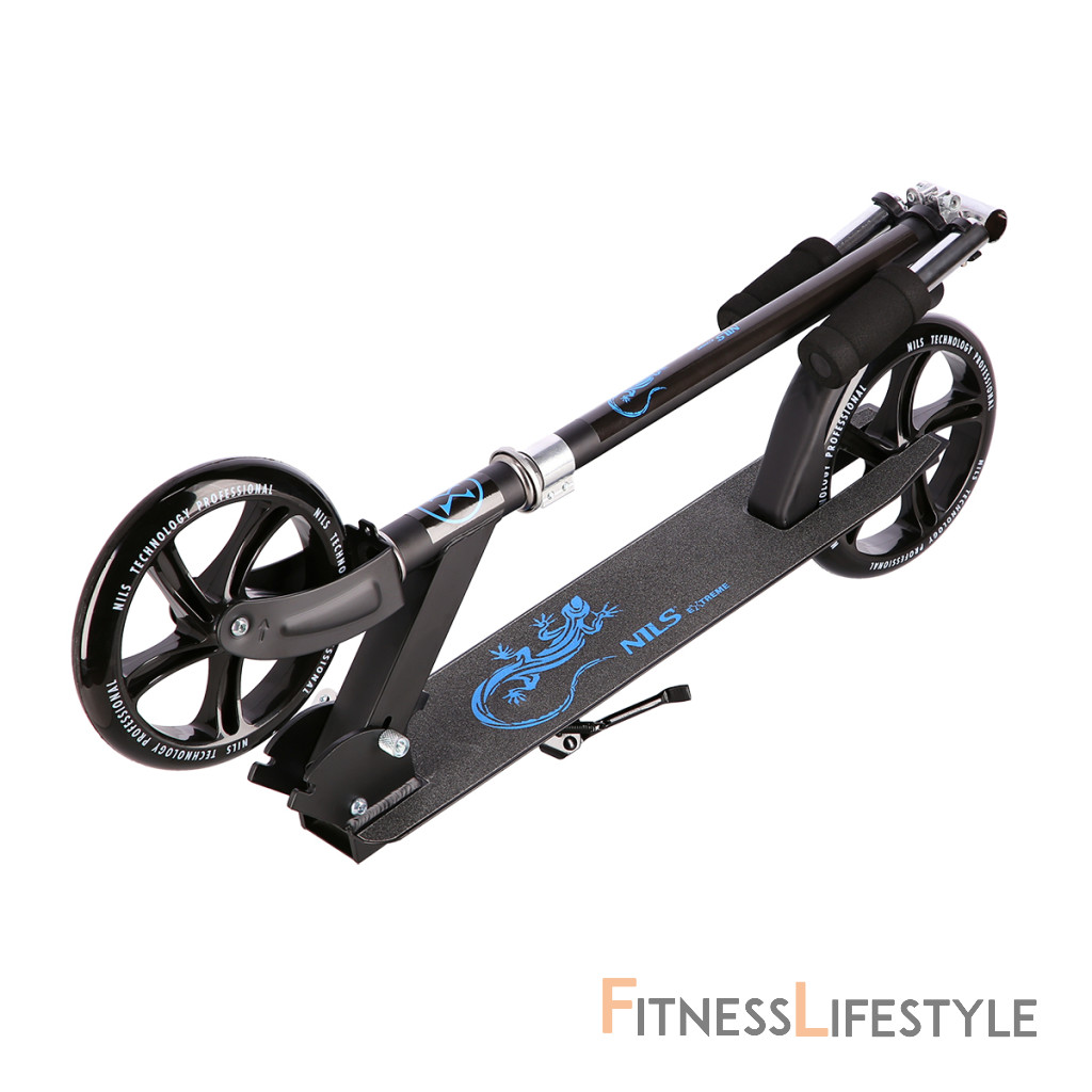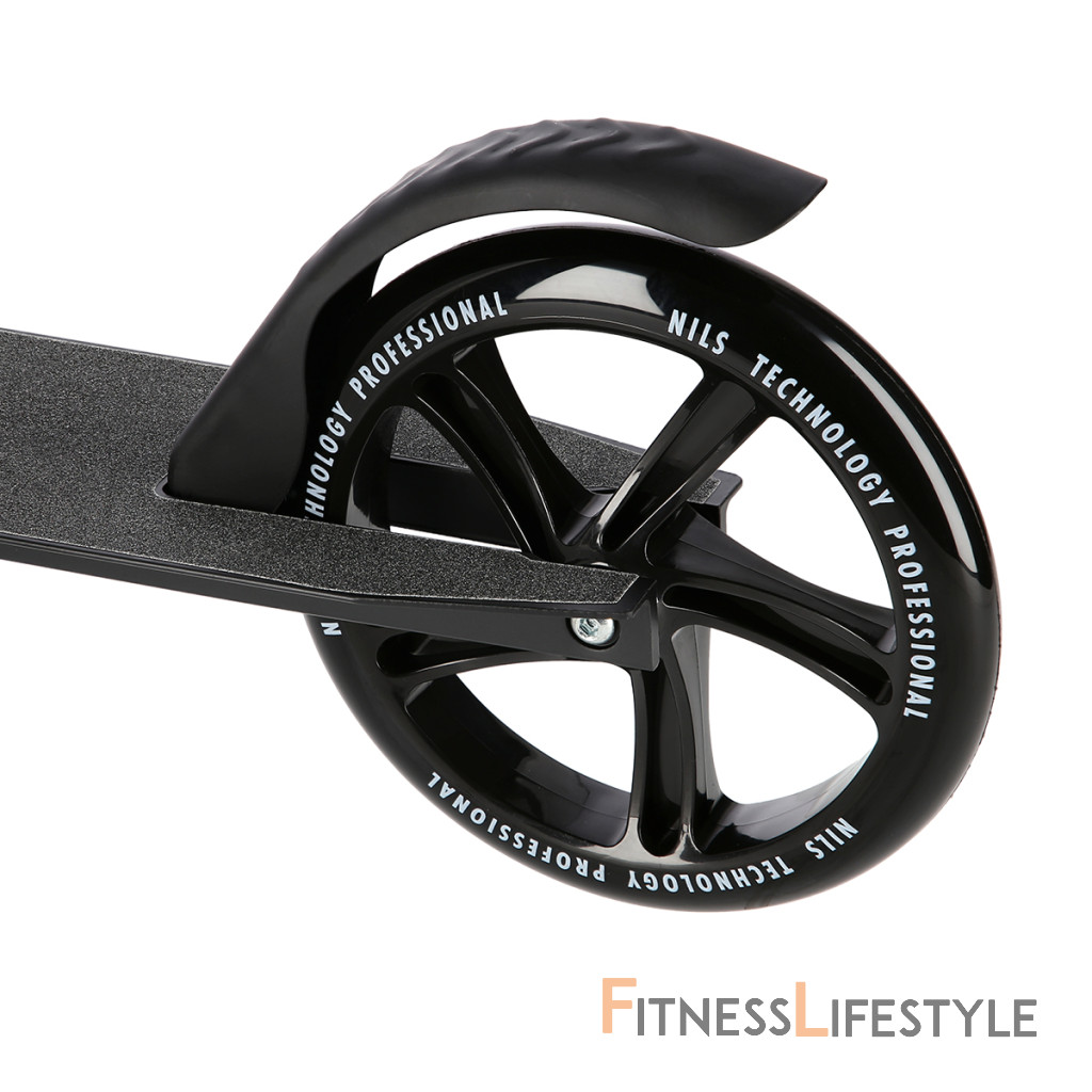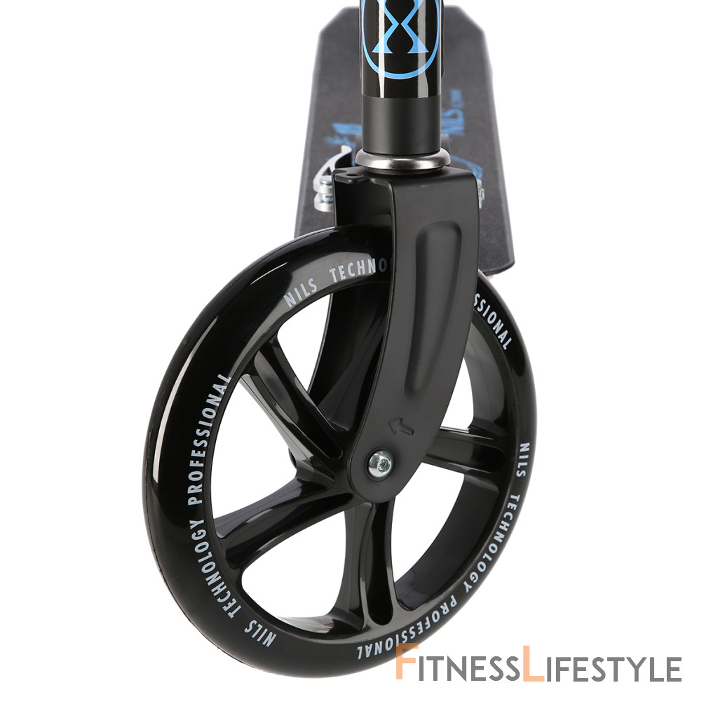Zadný blatník slúži ako nášľapná brzda. Sklopné riadidlá sú opatrené penovými rukoväťami, ktoré zaisťujú pevný a pohodlný úchop. Riadidlá sú výškovo nastaviteľné do 3 úrovní. Veľké kolesá sú osadené ložiskami ABEC 7 a polyuretánovou pneumatikou s priemerom 200 milimetrov. Táto kombinácia zaisťuje rýchlu, plynulú a bezpečnú jazdu. Sklopný stojan umožňuje postavenie kolobežky, takže ju nie je potrebné pokladať.
