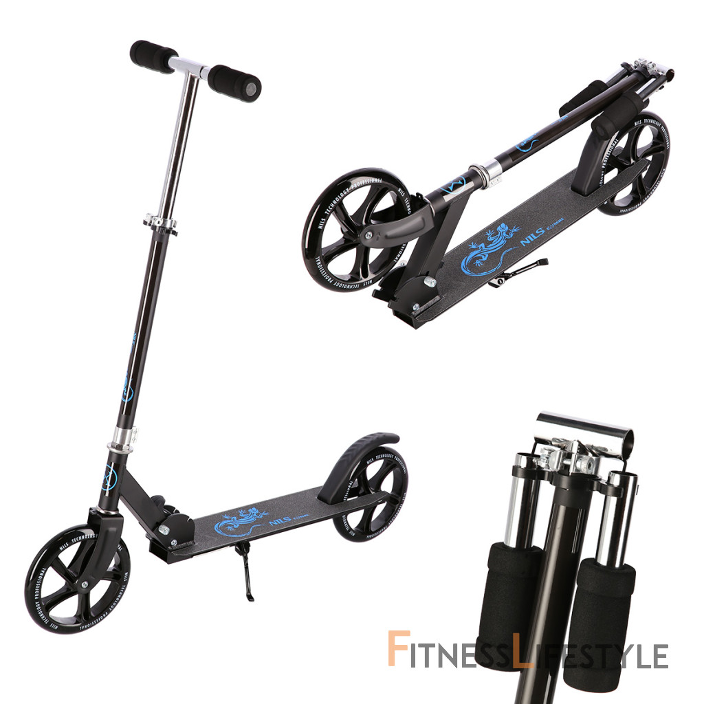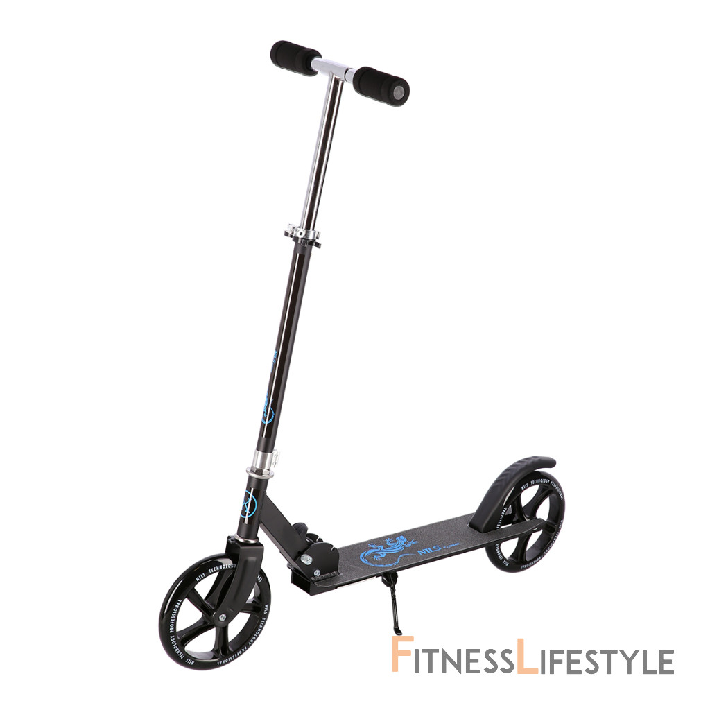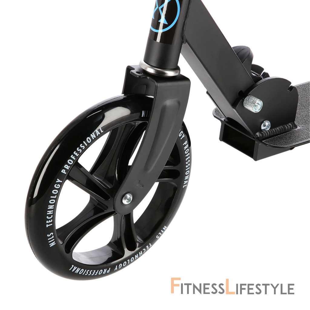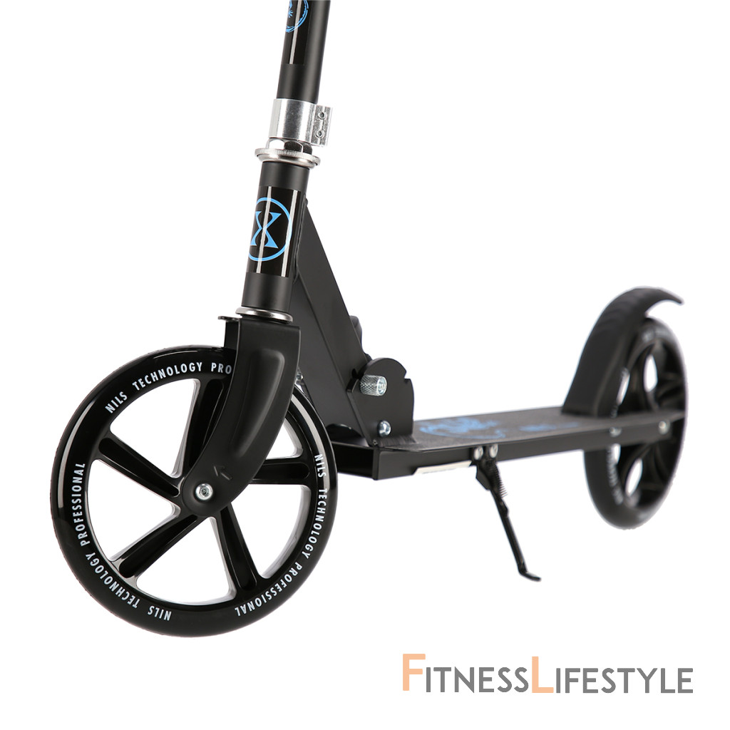 Zadný blatník slúži ako nášľapná brzda. Sklopné riadidlá sú opatrené penovými rukoväťami, ktoré zaisťujú pevný a pohodlný úchop. Riadidlá sú výškovo nastaviteľné do 3 úrovní. Veľké kolesá sú osadené ložiskami ABEC 7 a polyuretánovou pneumatikou s priemerom 200 milimetrov. Táto kombinácia zaisťuje rýchlu, plynulú a bezpečnú jazdu. Sklopný stojan umožňuje postavenie kolobežky, takže ju nie je potrebné pokladať.