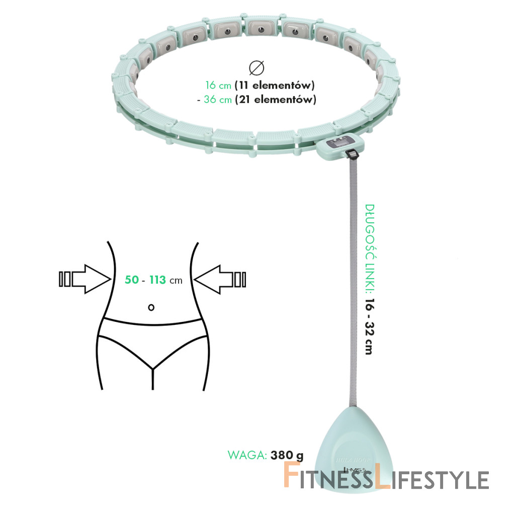 HMS HHM14 je hula hop obruč s nastaviteľnou dĺžkou, masážnymi magnetickými výstupkami a rotujúcim závažím.