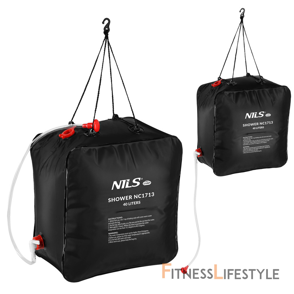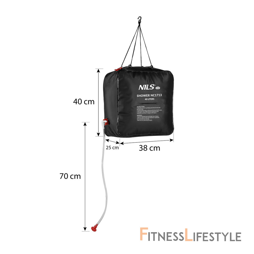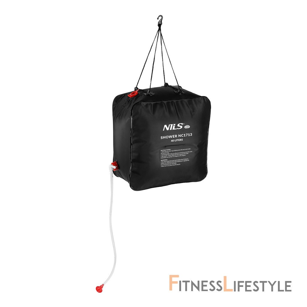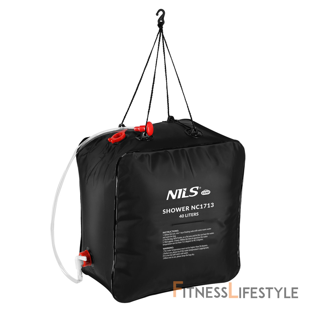 NILS Camp NC1713 je solárna, cestovná sprcha s objemom 40 litrov, ktorá sa skvele hodí pre všetkých, ktorí trávia čas kempovaním, cestovaním alebo kdekoľvek, kde nie je prístup k tečúcej vode. Sprcha NC1713 má na hornej strane nádrže 4 oká, ku ktorým sa pripevnia dodávané šnúry s háčikom a sprcha sa následne zavesí napríklad na vetvu stromu tak, aby bola vystavená slnčnému žiareniu. Čierna farba urýchľuje ohrev vody vo vnútri nádrže a tá sa môže za niekoľko hodín na slnku ohriať až na 48 °C. Nádrž je vyrobená z nepriepustného, odolného materiálu, ktorý vydrží mnoho sezón. Napúšťanie sa vykonáva pomocou horného plniaceho otvoru so zátkou. Súčasťou sady je vypúšťací ventil a hadica so sprchovacou koncovkou. Pri roumnom dávkovaní vody je plná 40l nádrž schopná obslúžiť 4 osoby. Parametre: Upozornenie: